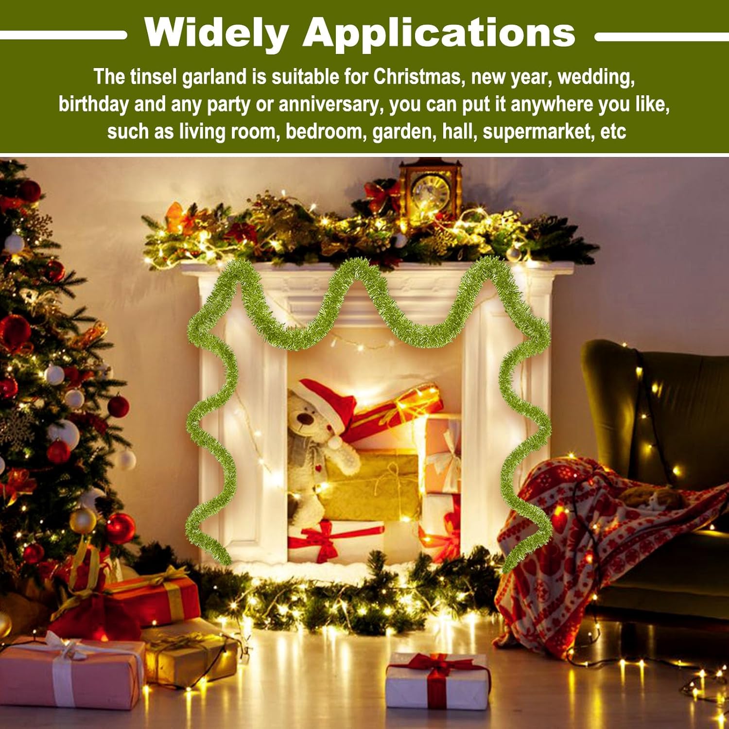 - Wide Application: Suitable for all kinds of special days, such as christmas, new year, valentine's day, halloween, festivals, wedding, engagement, bridal baby shower, graduation celebrations. The tinsel garland are perfect decorations for party, home decorations, parade float, garden, christmas tree, christmas wreath, wall, ceiling, door, hedge, stair rail, doorway, window, pole, table and so on