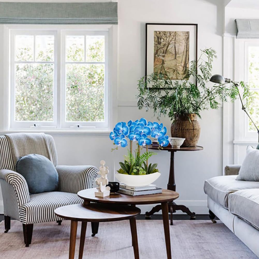 - Dimensions: Standing 18 inches high, the blue orchid flower arrangement includes a ceramic boat-shaped vase that measures 12 inches in diameter, making it an ideal size for various decor settings in both home and office environments.