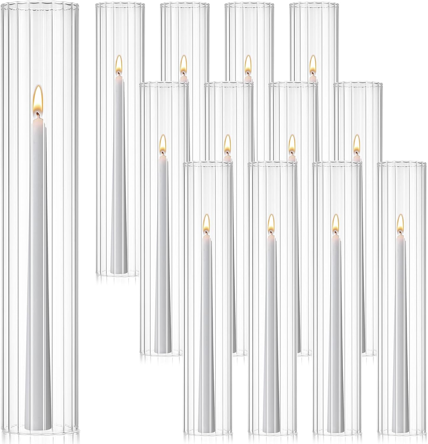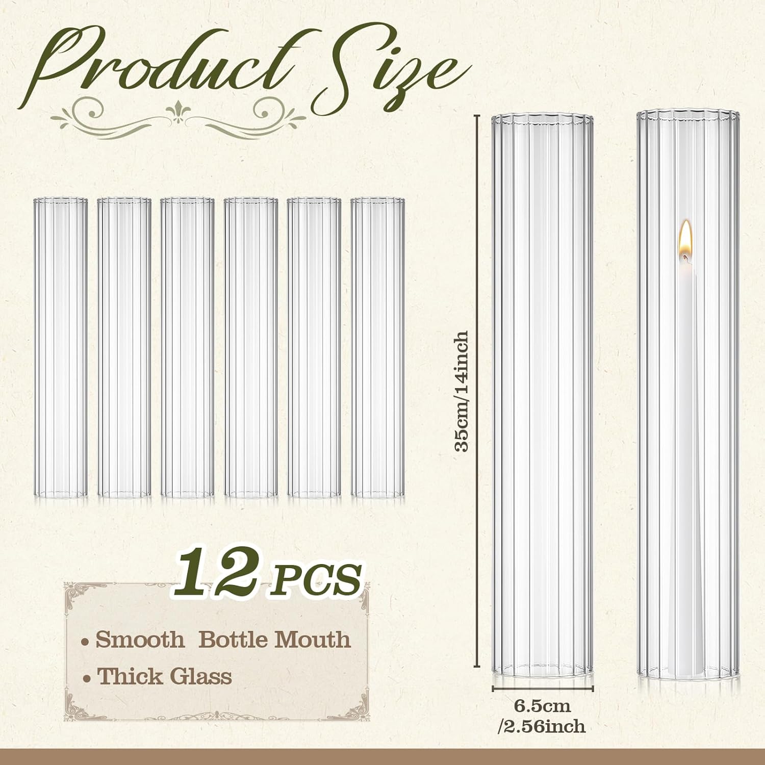 12 Pcs Hurricane Glass Candle Holders 2.5 x 14 Open Ended Tube Ribbed Shade Bottomless Chimney Cylinder Taper Candle Cover for Wedding Anniversary Table Centerpiece