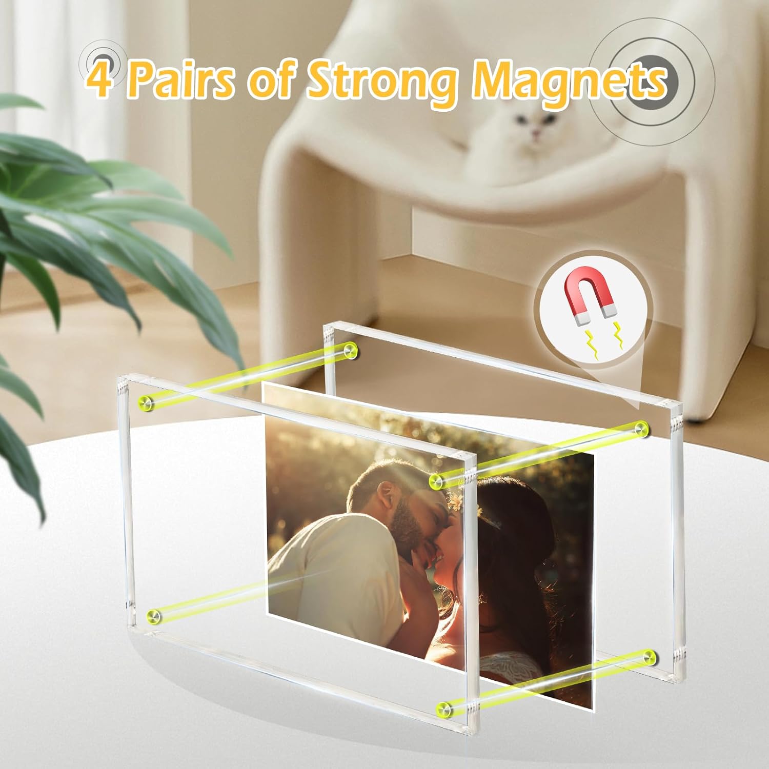 - Magnets Picture Frame: This picture frame made of 2 premium clear acrylic panels and 1 acrylic base. Two panels are held together by four pairs of magnets. With those strong magnets,the frames are very easy to use. Just seperate 2 panel and put the photo in, the magnets will holds the photo, then put the panel on the base, you will get a beautiful tabletop frame