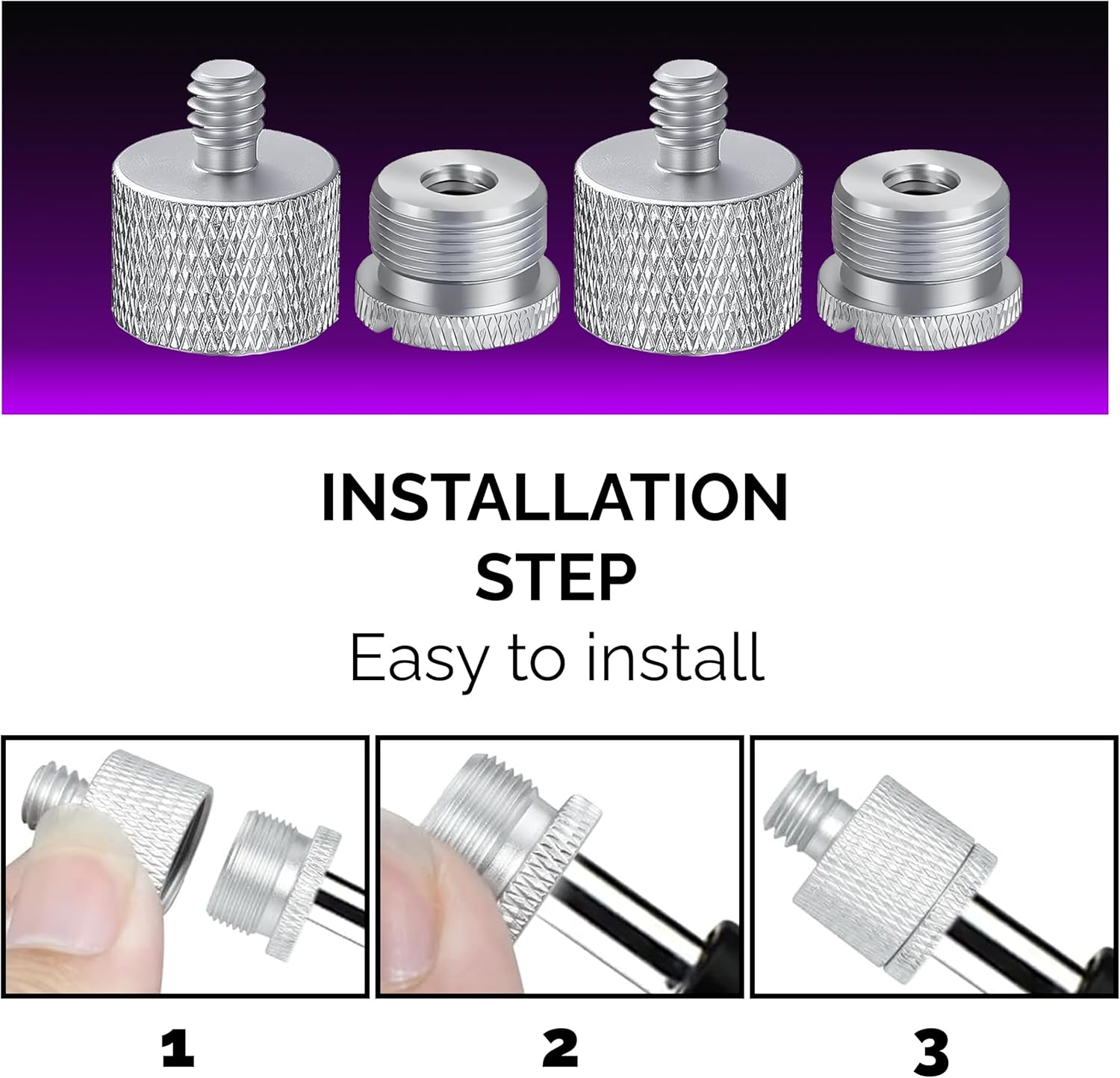 - Non Slip And Secure Grip: We designed the mic thread adapter set with a knurled surface that provides a non-slip grip to make assembly and disassembly simpler. The microphone stand adapters are deep without any burrs for a stable fit on most mic stands