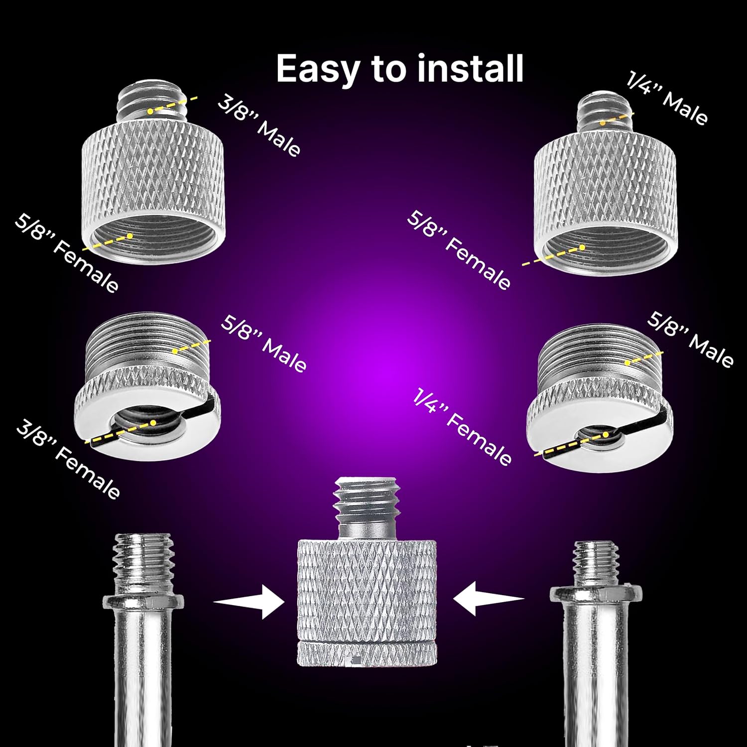 - 4 Male And 4 Female Adapters: Each microphone adapter set comes with 3/8 female to 5/8 male, 5/8 female to 3/8 male, 1/4 female to 5/8 male, and 5/8 female to 1/4 male screw thread adapters that provide a suitable fit for most mic stands the simple way