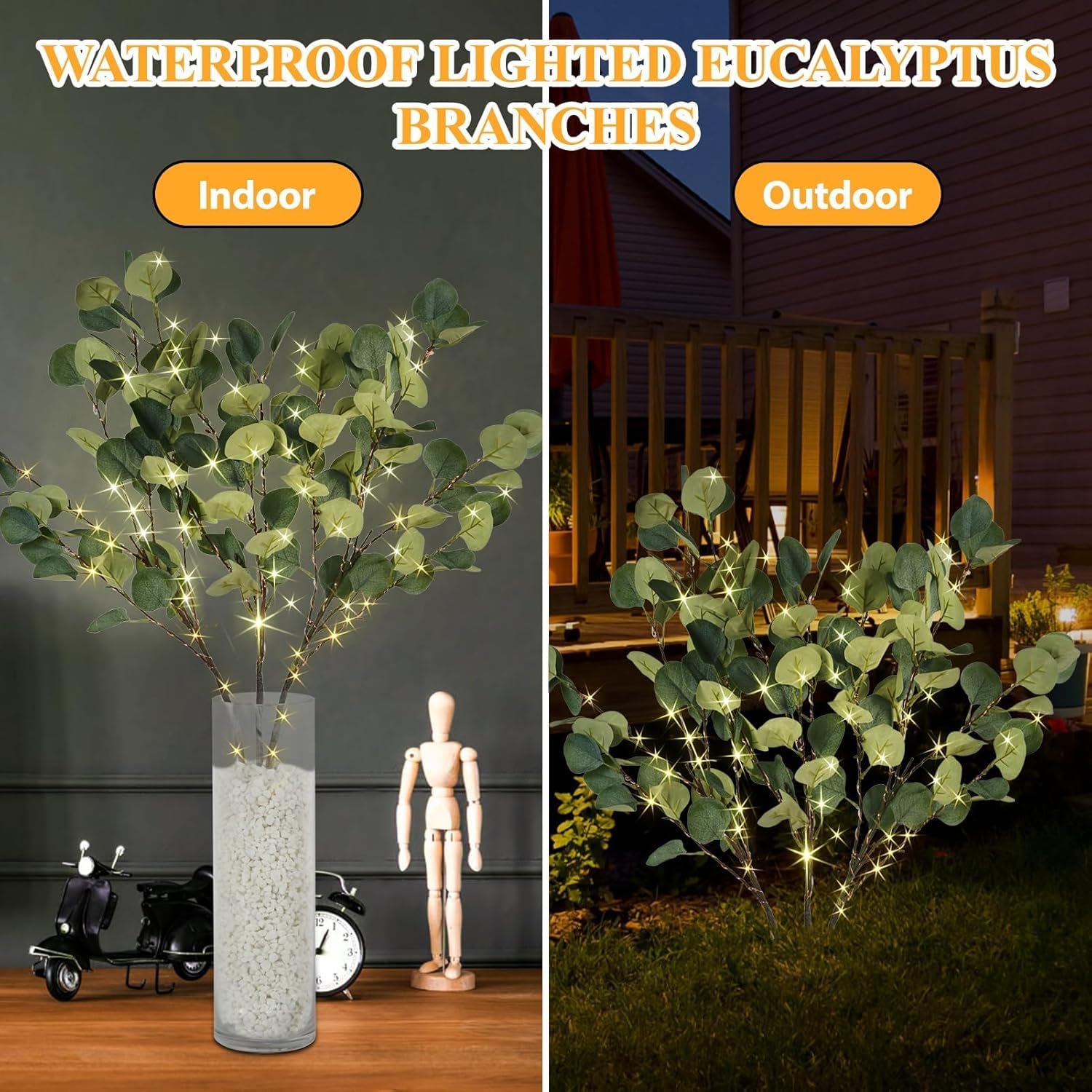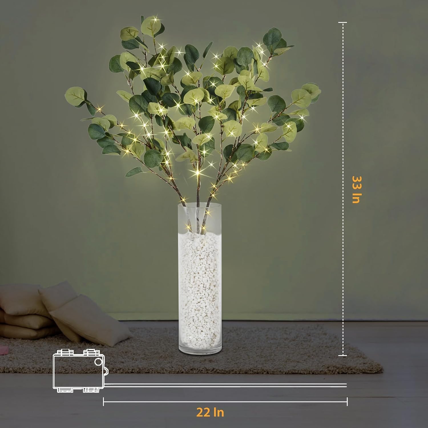 - 🎄【You can DIY】The lighted eucalyptus branches are 33in high and contain 99 warm white LED lights. The texture of these eucalyptus-lighted branches is soft and sturdy, it is easy to bend into any shape. You are free to DIY into what you want, you can also put some Christmas, Easter, and other festive decorations on the lighted branches to decorate it