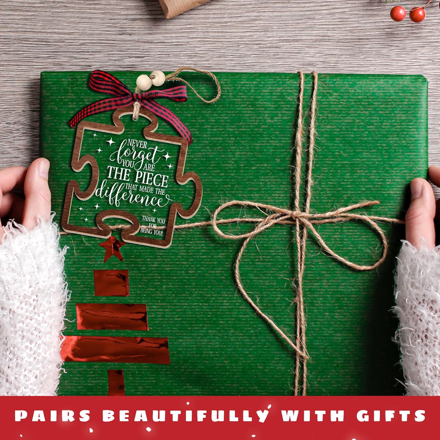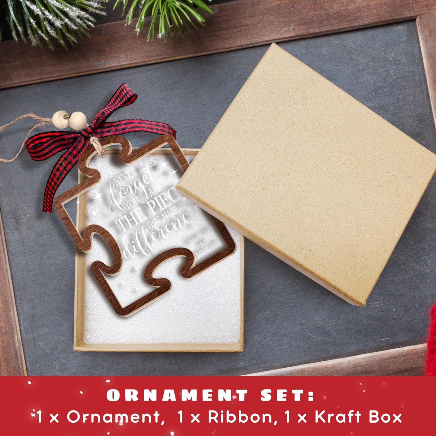 - THANK YOU ORNAMENT SET INCLUDES: You will receive 1x Wood and Acrylic Ornament, 1x Twine Rope Ribbon, and 1x Kraft Christmas Gift Box. This twine rope also features two wooden beads and a caro red ribbon. The included instruction sheet will show step-by-step how to tie the rope with your ornament. By following these instructions, you'll able to create a unique and rustic look for your Christmas tree.