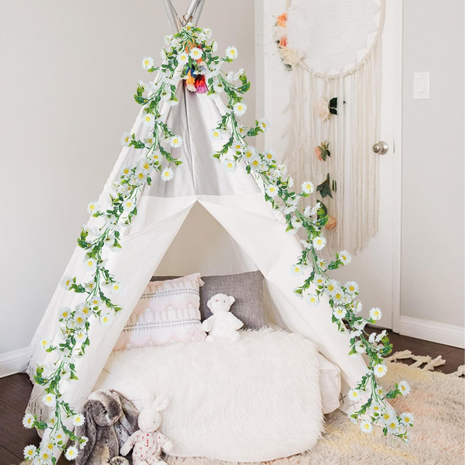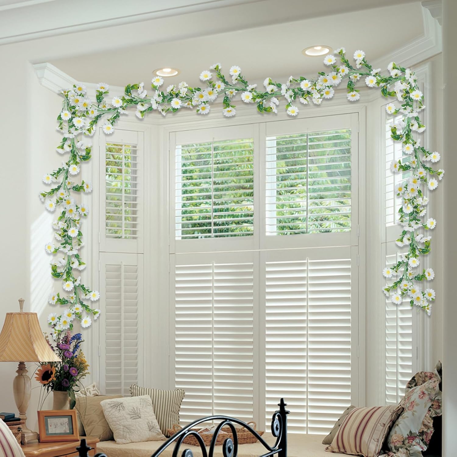 - Greenery garland with flowers are composed of silk daisy flowers, plastic green leaves and plastic stems. Silk flower heads are bright and natural in color, exquisite in workmanship, which is very suitable for lighting up your home space.