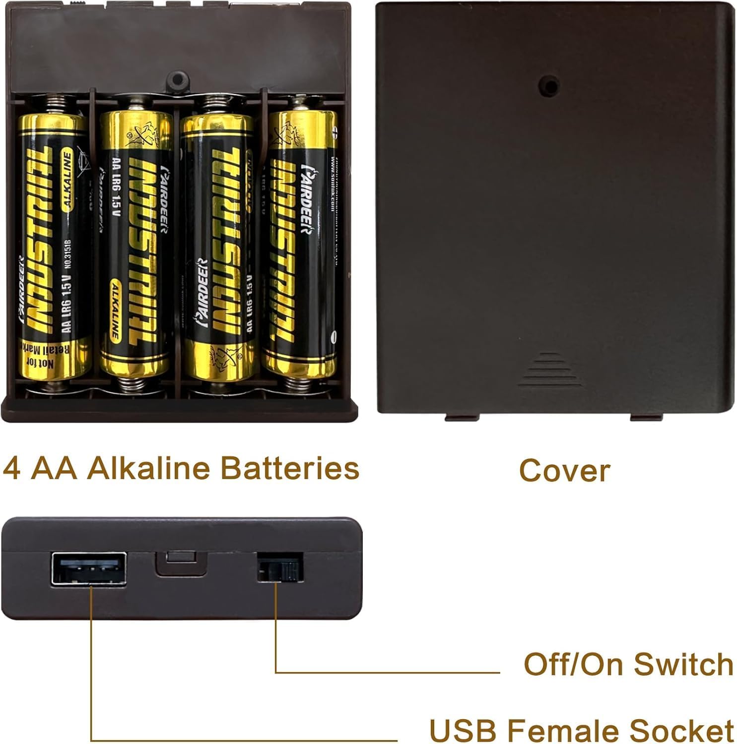 - 🎄【SAFE USB POWER SUPPLY】:1Pcs 4 AA batteries holder 6V with USB female socket and On/Off switch(Batteries Included),Also you can connect it with power bank, USB adapter, TV, phone charger and any others with USB port.