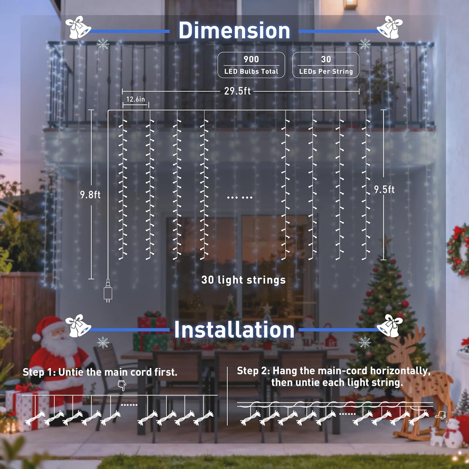 - ULTRA-LONG 900 LED CHRISTMAS CURTAIN LIGHTS: The Christmas curtain lights come with 30 light strands, each containing 30 LEDs for a total of 900 LEDs. It gives off a cool white, soft glow, and really adds a nice touch of oomph to your Christmas. The 9.5x29.5ft extra-long white Christmas curtain lights make them sufficient to cover windows and walls, great for your Christmas decor. NOTE: for stability of light brightness, multiple sets of the white curtain lights can NOT be connected.