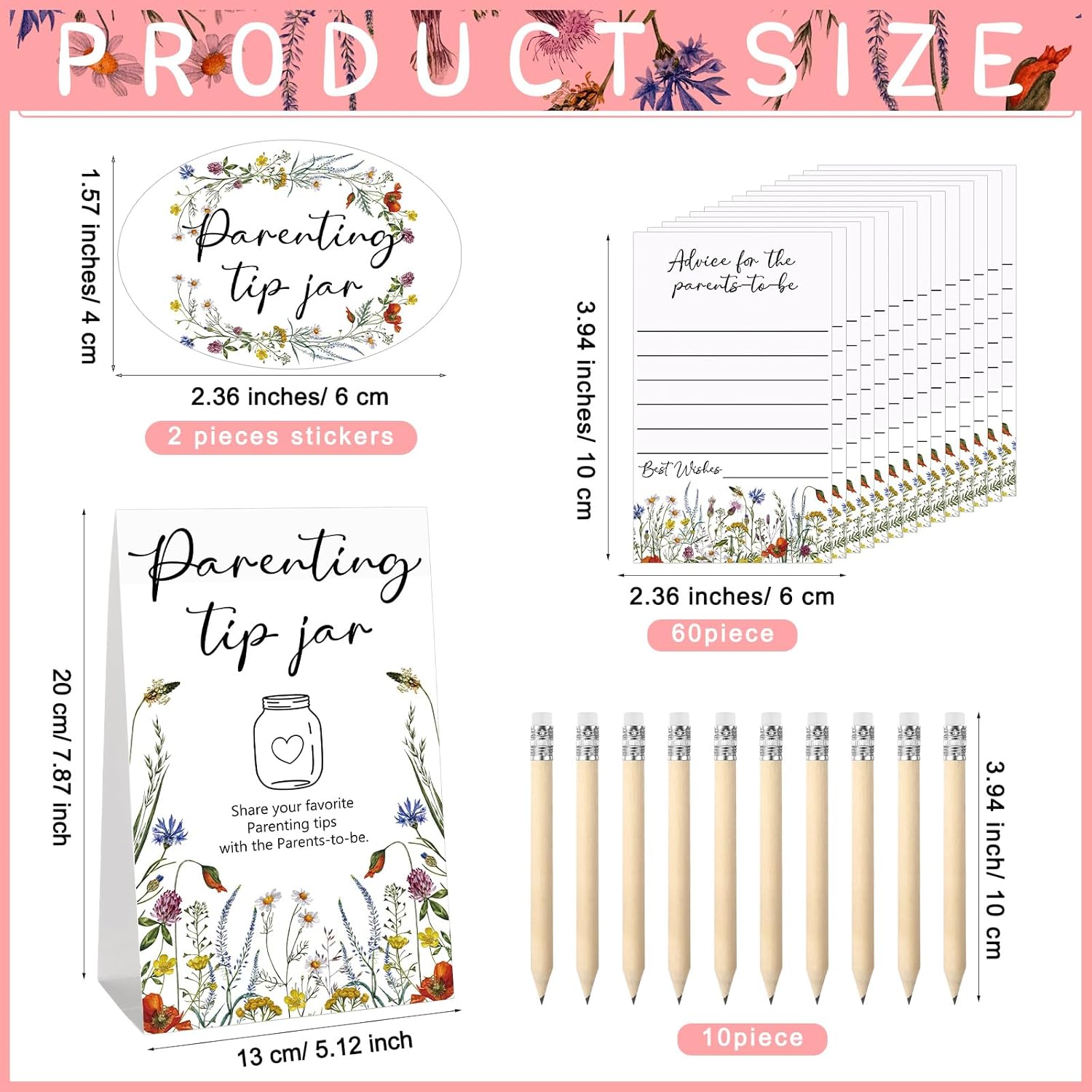 - Baby Shower Cards Set: the package contains 1 piece of parenting wild flower theme tip jar sign, 60 pieces of tips wild flower theme cards for the parents to be, 10 pieces of pencils, 2 pieces of cute stickers, and 1 PET bottle, enough quantity and delicate design to meet your use needs