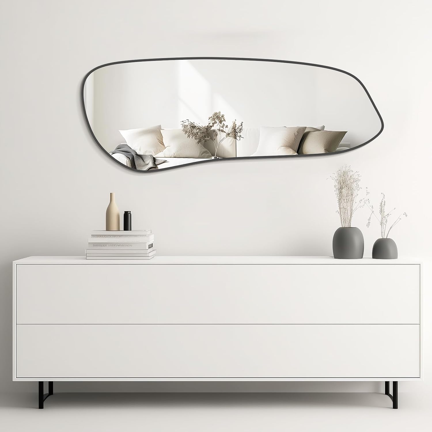 - The irregular wall mirror is look like a art, to make the room of the house look more interesting. This asymmetrical abstract irregular-shaped mirror perfectly fits wall decor and artistic display for the living room, bedroom, bathroom, or hallway and entry wall.