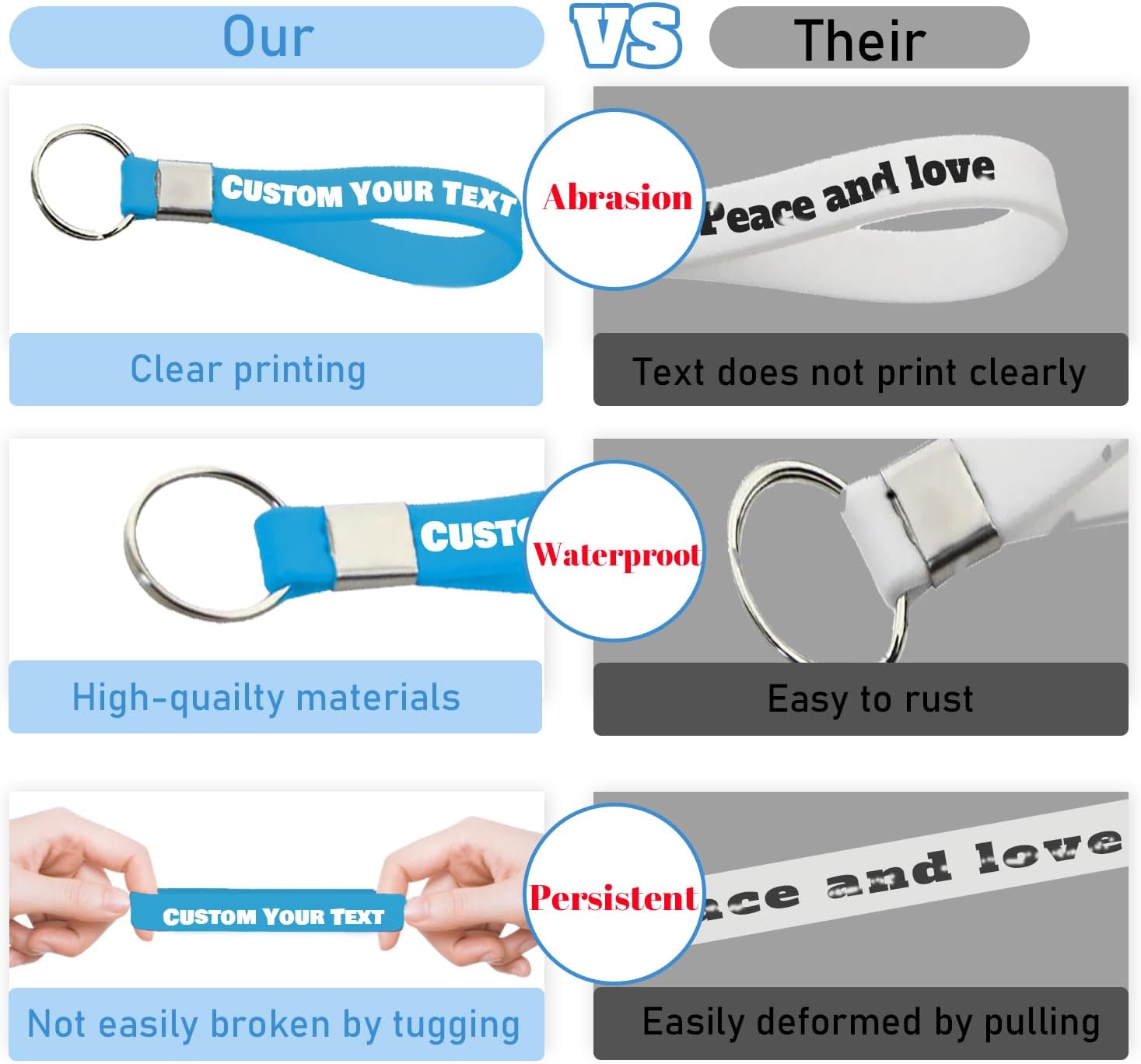 - Personalized Silicone Keychain: Click "Customize Now" button, choose your favorite color and font, enter your personalized text, and you will receive unique keychains designed by you.