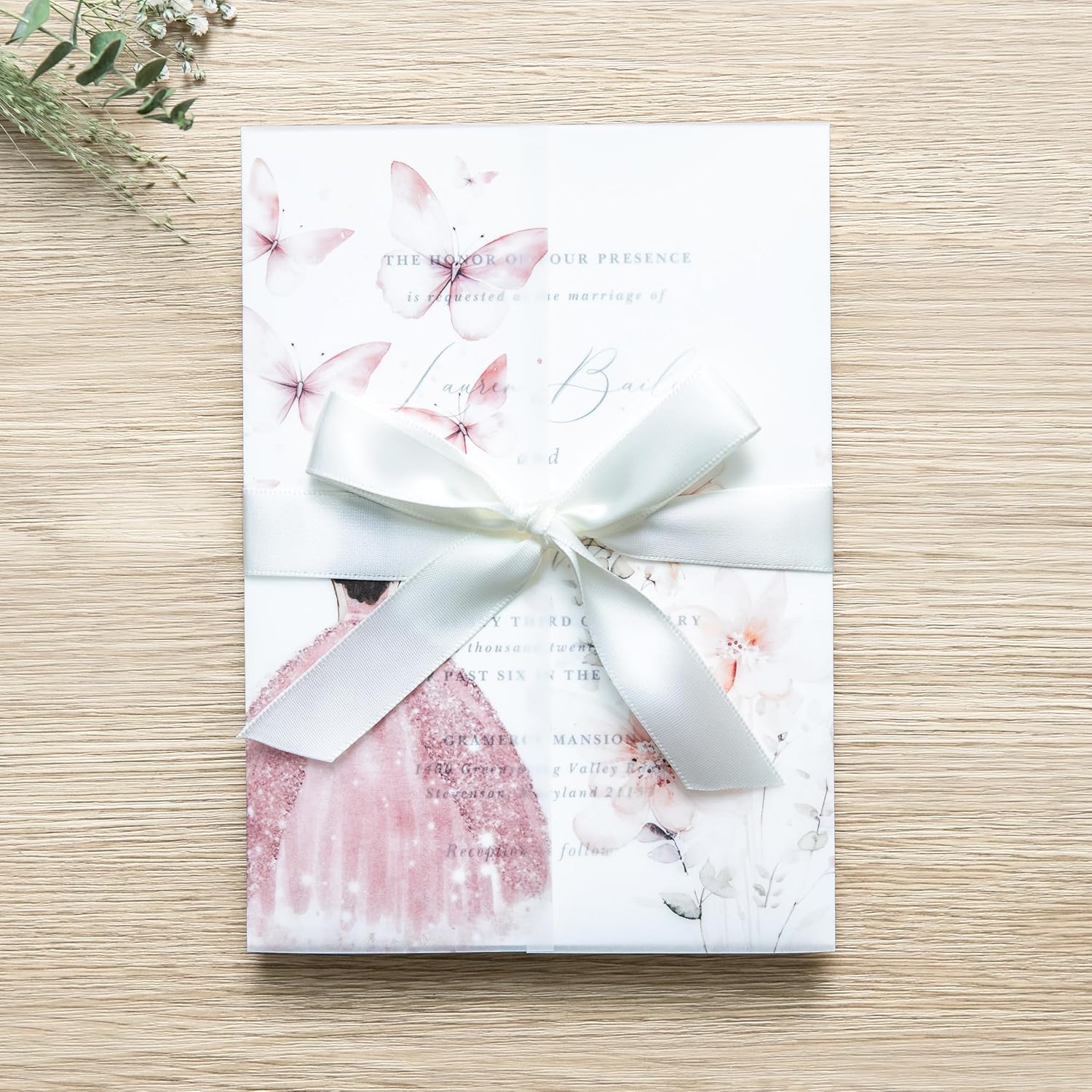PONATIA 50 PCS Vellum Jackets for 5x7 Invitations - 135GSM Pink Girl Vellum Jacket Sleeves - Butterfly Quinceanera Invitations Wraps for XV Anos