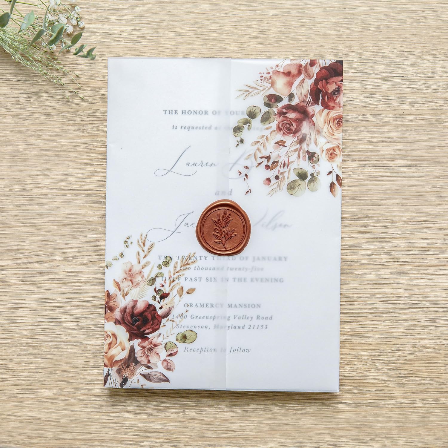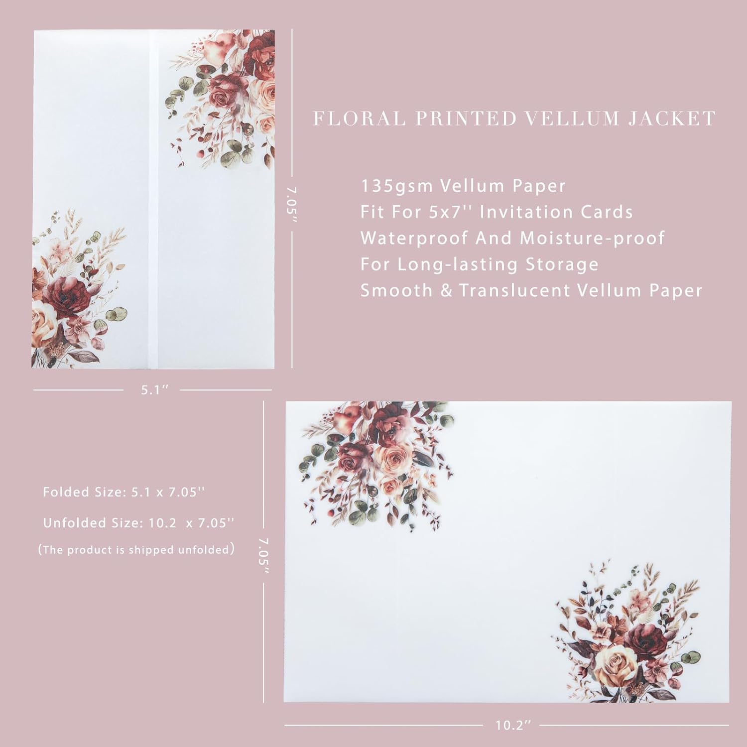 - 【What's Included】: 50 pieces burnt orange floral 5x7 vellum jackets