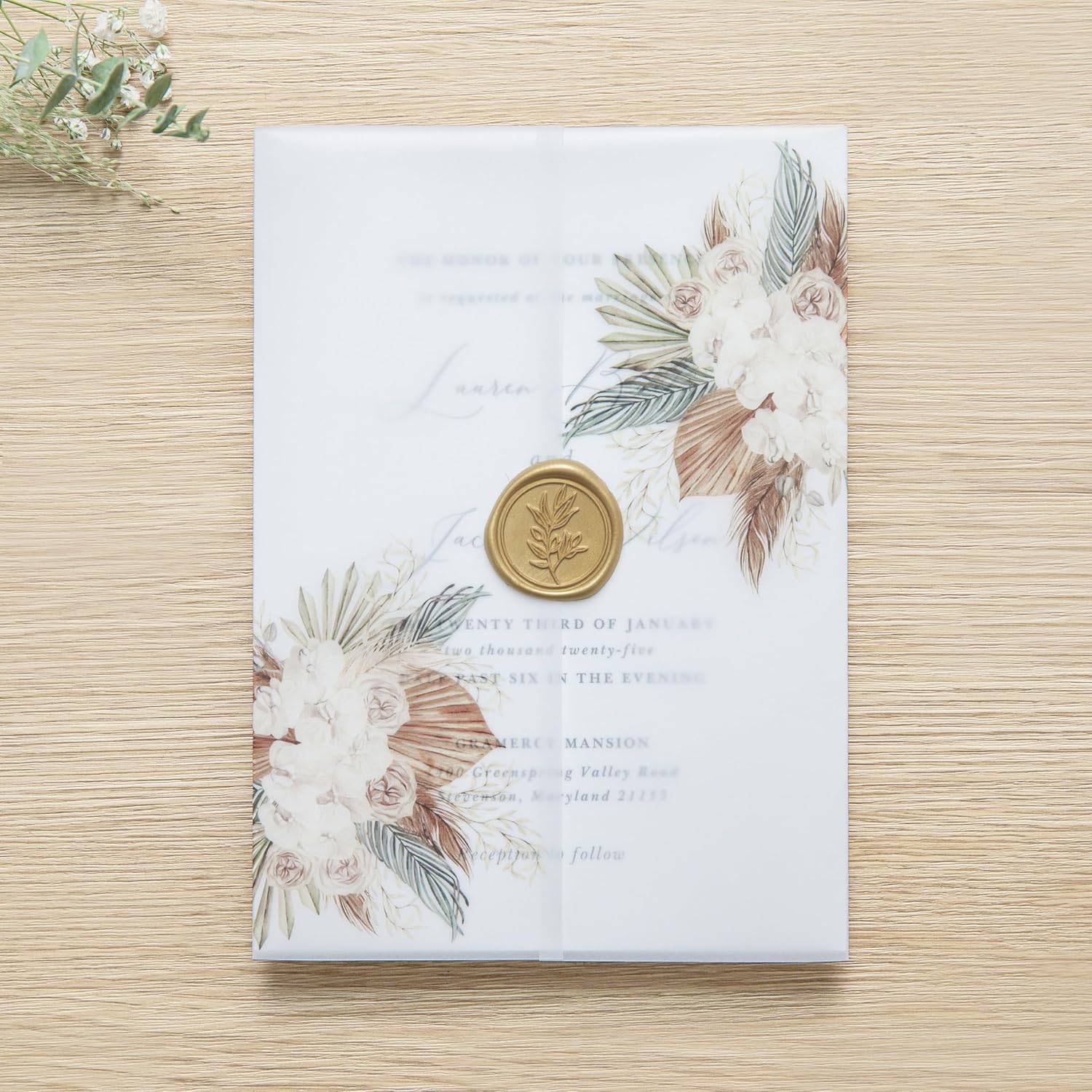 PONATIA 50PCS Vellum Jackets for 5x7 Invitation Cards- 135GSM Boho Flowers Vellum Sleeves Paper - Wedding Invitations Wraps - Transparent Card Jacket
