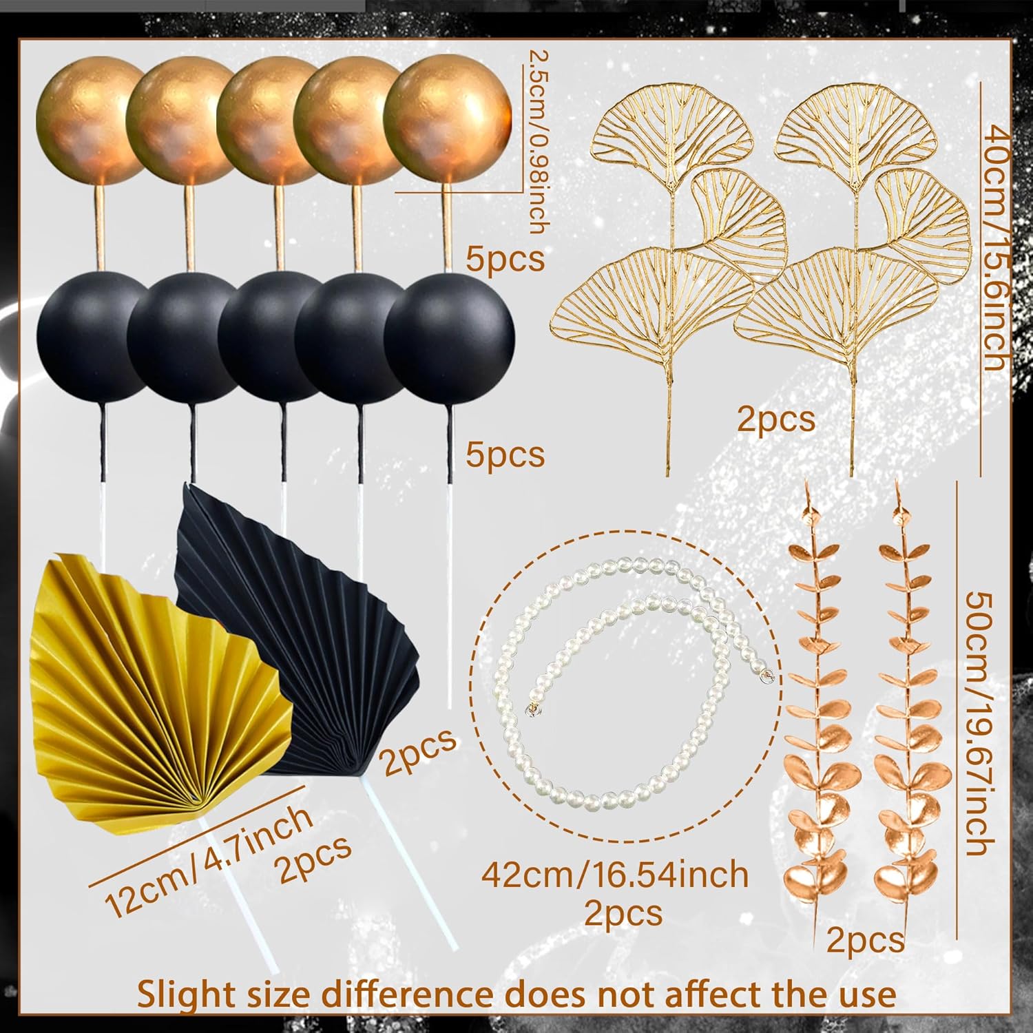 - You will receive 1 x Pearl Chain Cake Topper, 5 x Gold Cake Balls, 5 x Black Cake Balls, 4 x Two Different Leaves, 2 x Black Folding Fans, 2 x Gold Folding Fans. The dimensions are as shown in the picture, a perfect set of cake toppers for your DIY needs!