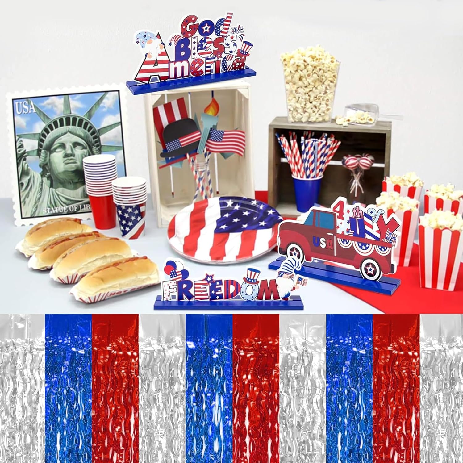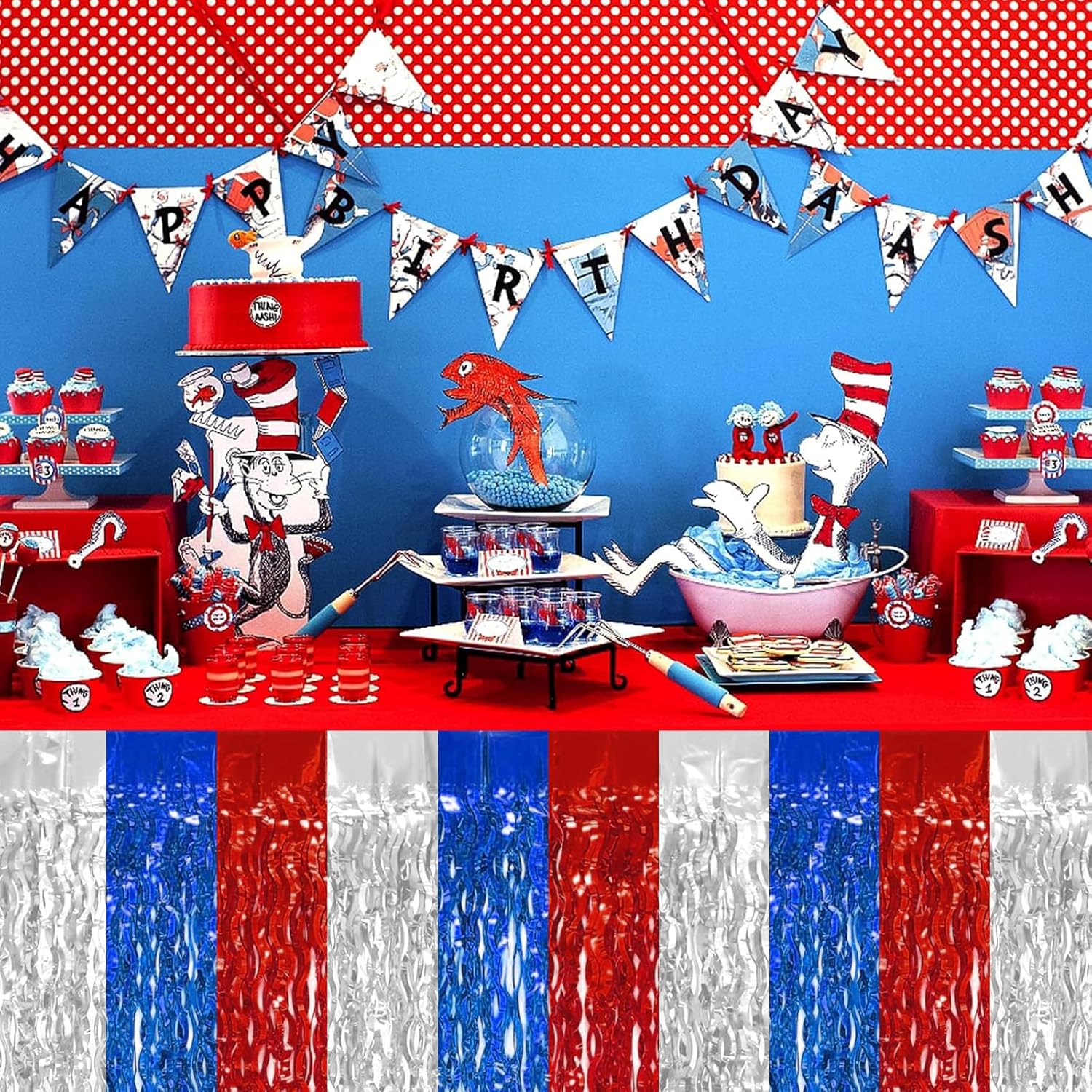 4P Wavy Metallic Tinsel Foil Fringe Table Skirts for Rectangle Tables Backdrop Garland Curtains for Parade Floats Wedding Birthday Parties Decoration Graduation 2025 Christmas (Red Blue White)