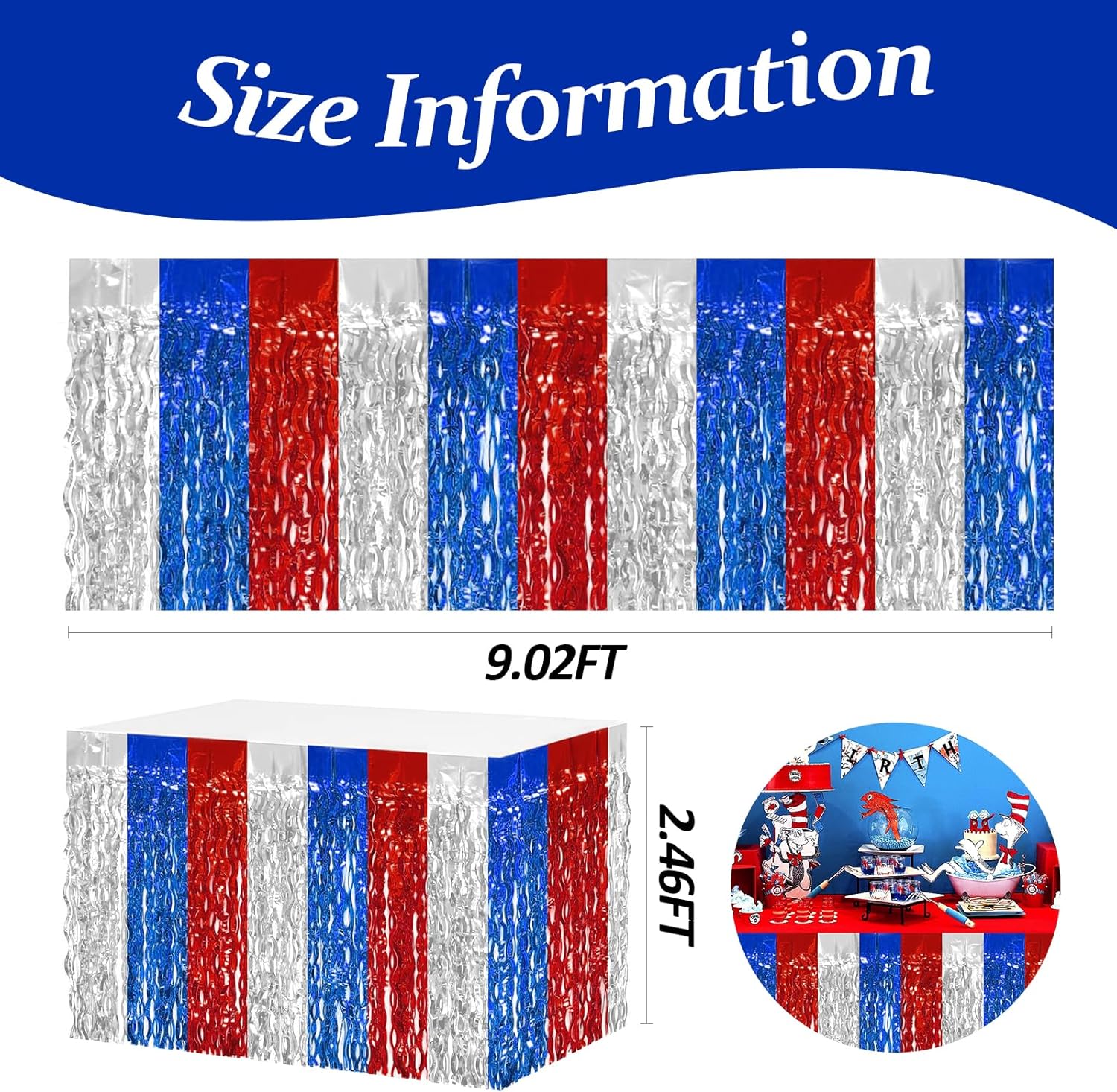 - 【 Material】 4 Pack Wavy Foil Fringe Tinsel Table Skirt: 30in x 108in(W*L) made of tinsel with a shiny surface and a lightweight durable metallic fringe skirt, not easy to wrinkle or tear. Please confirm the size your need before buying.