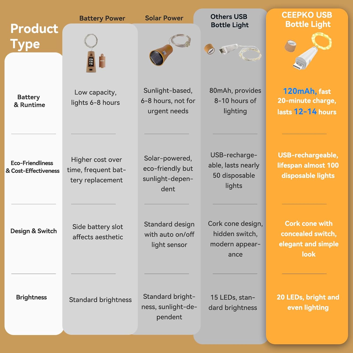 - Long Battery Life for USB Bottle Lights: Built-in 120mAh rechargeable battery provides 12β14 hours of continuous lighting on a single charge; perfect for long-lasting wine bottle fairy lights at parties, events, or home decor