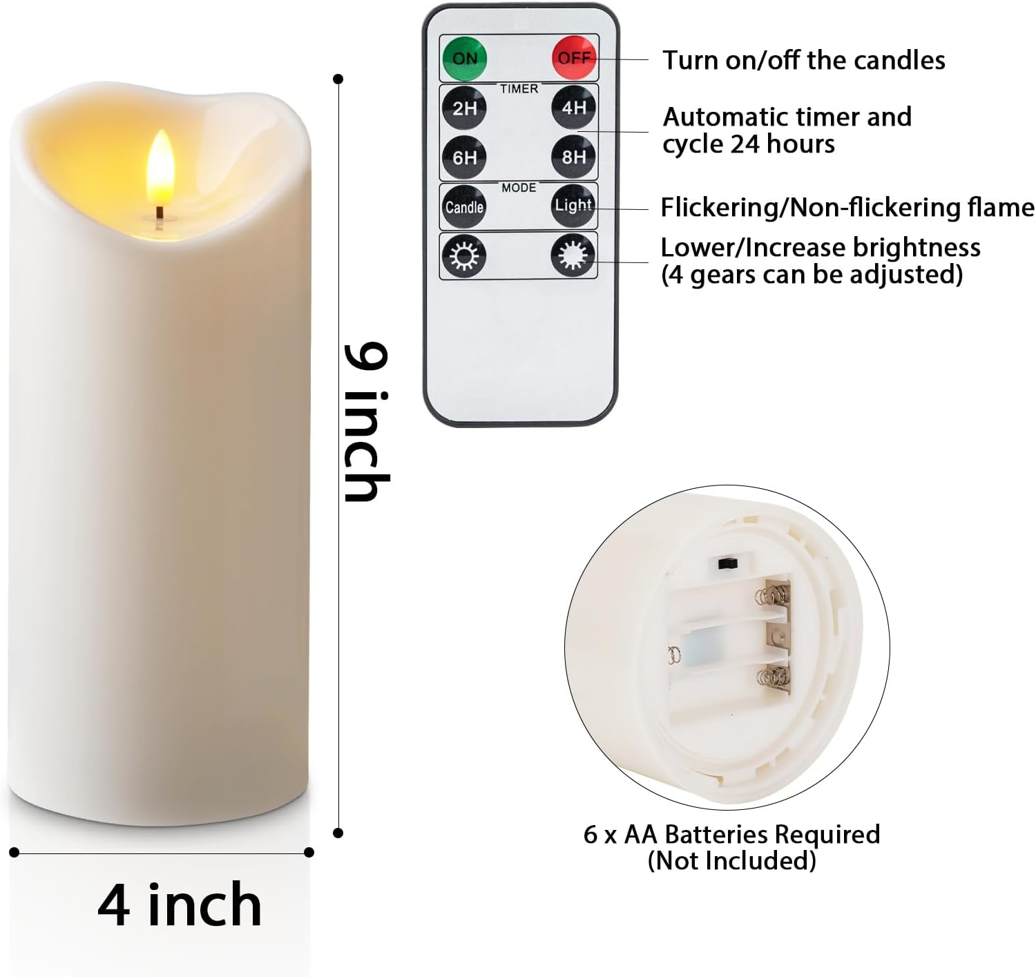 - Package List: You will receive 2 set large candles (4” in diameter and 9” in height), each candle requires 3 AA batteries (batteries Not included), 1 remote control, and 1 manual.