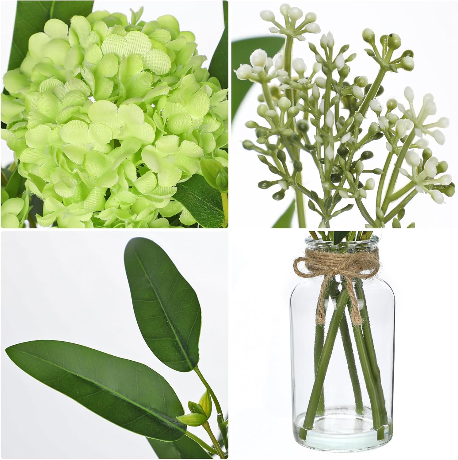 Hollyone Green Hydrangea Artificial Flowers in Clear Glass Vase with Faux Water Silk Hydrangeas Fake Flowers Floral Arrangement for Home Bathroom Kitchen Office Table Centerpiece Shelf Decorations