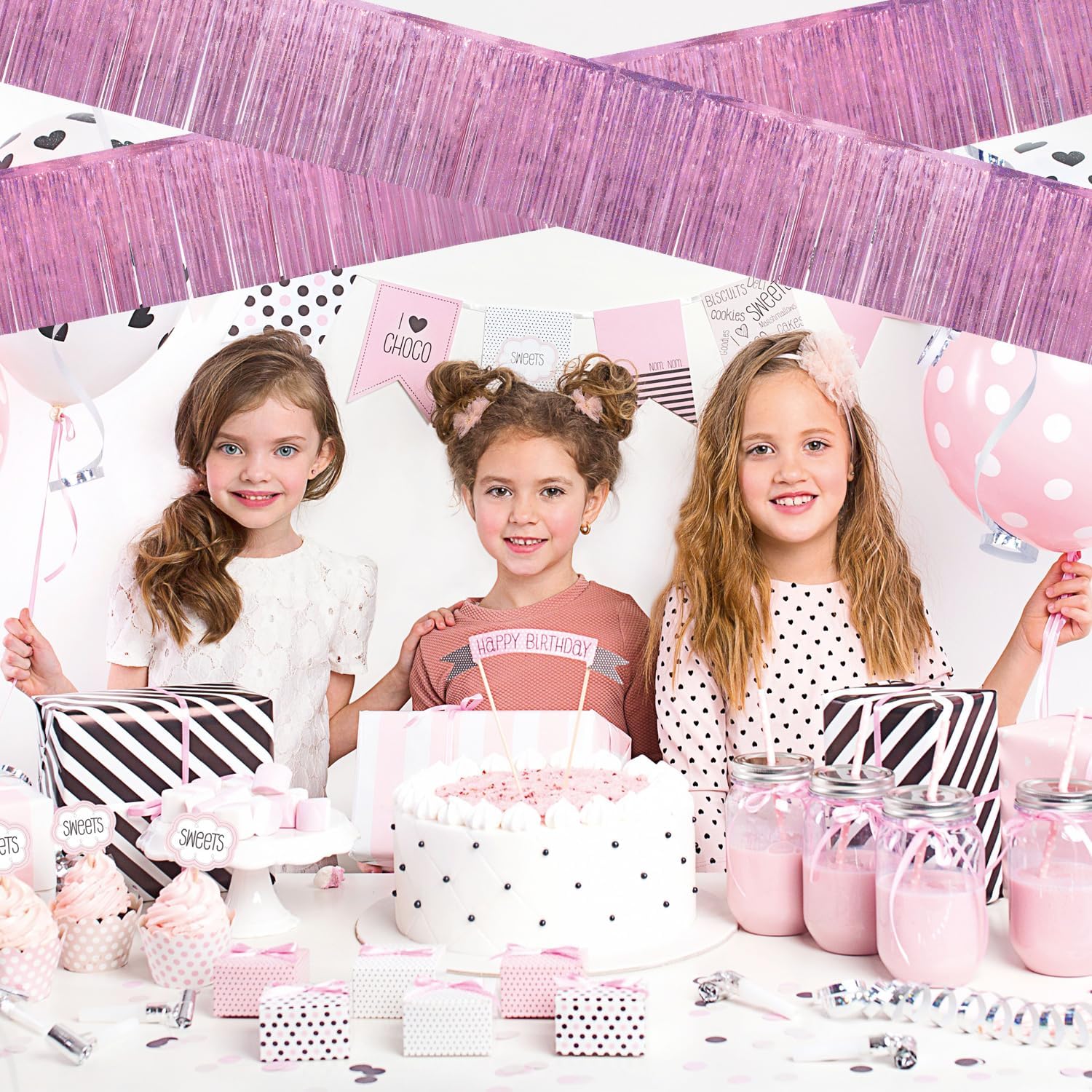 - DIY: Cut the pink party decorations to width and hanging them in different locations for a fuller effect. Alternatively, verlap two fringe garland to achieve unexpected visual effects!