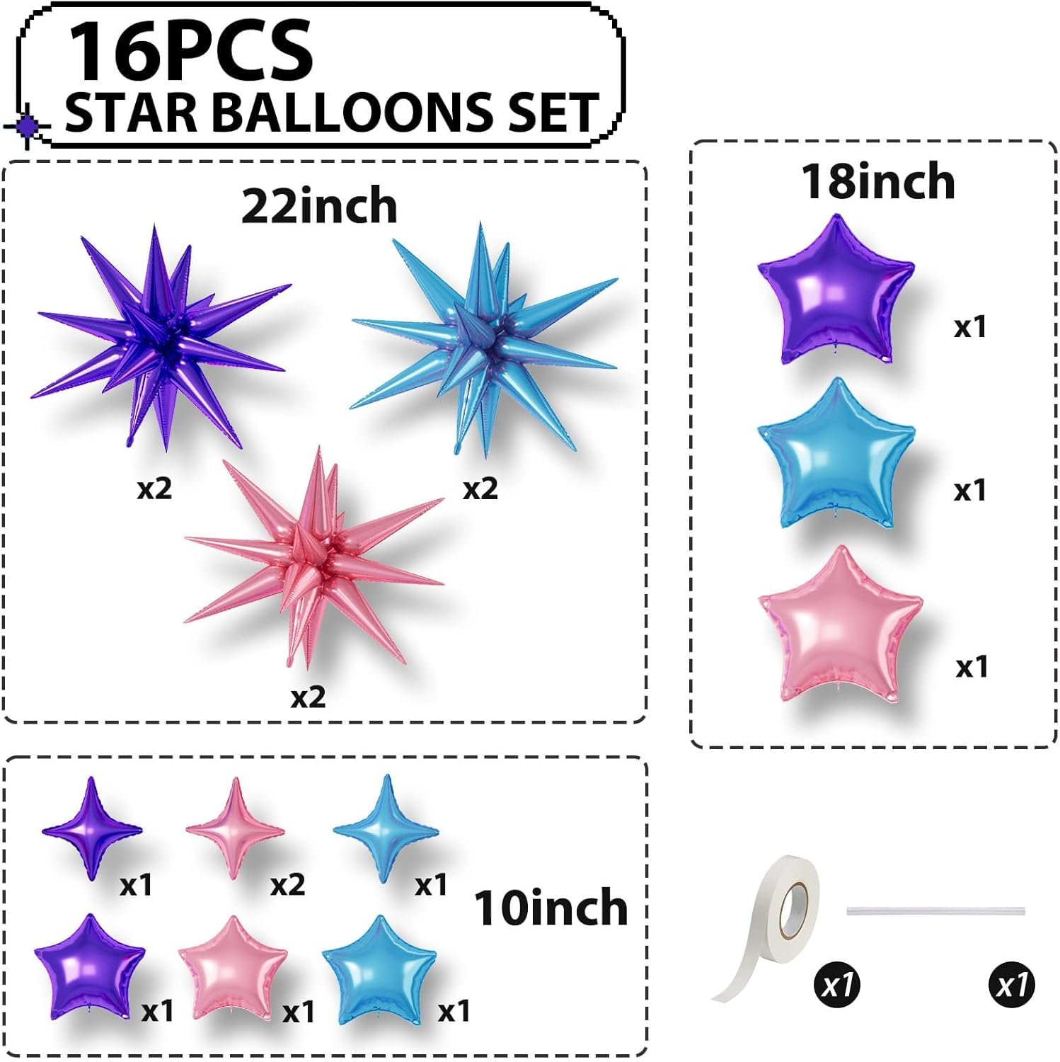 - ăPink Purple Blue Star BalloonsăThe package includes:6pcs 22-inch Star-Shape balloons(Pink*2,Purple*2,Light Blue*2), 4pcs 10-inch Four-Pointed Star balloons(Pink*2,Purple*1,Light Blue*1), 3pcs 18-inch Five-Pointed Star balloons(Pink*1,Purple*1,Light Blue*1), 3pcs 10-inch Five-Pointed Star Shape balloons(Pink*1,Purple*1,Light Blue*1),1 dispense and 1 straw. These foil star balloons are Great for birthdays, weddings, baby showers, and engagement parties