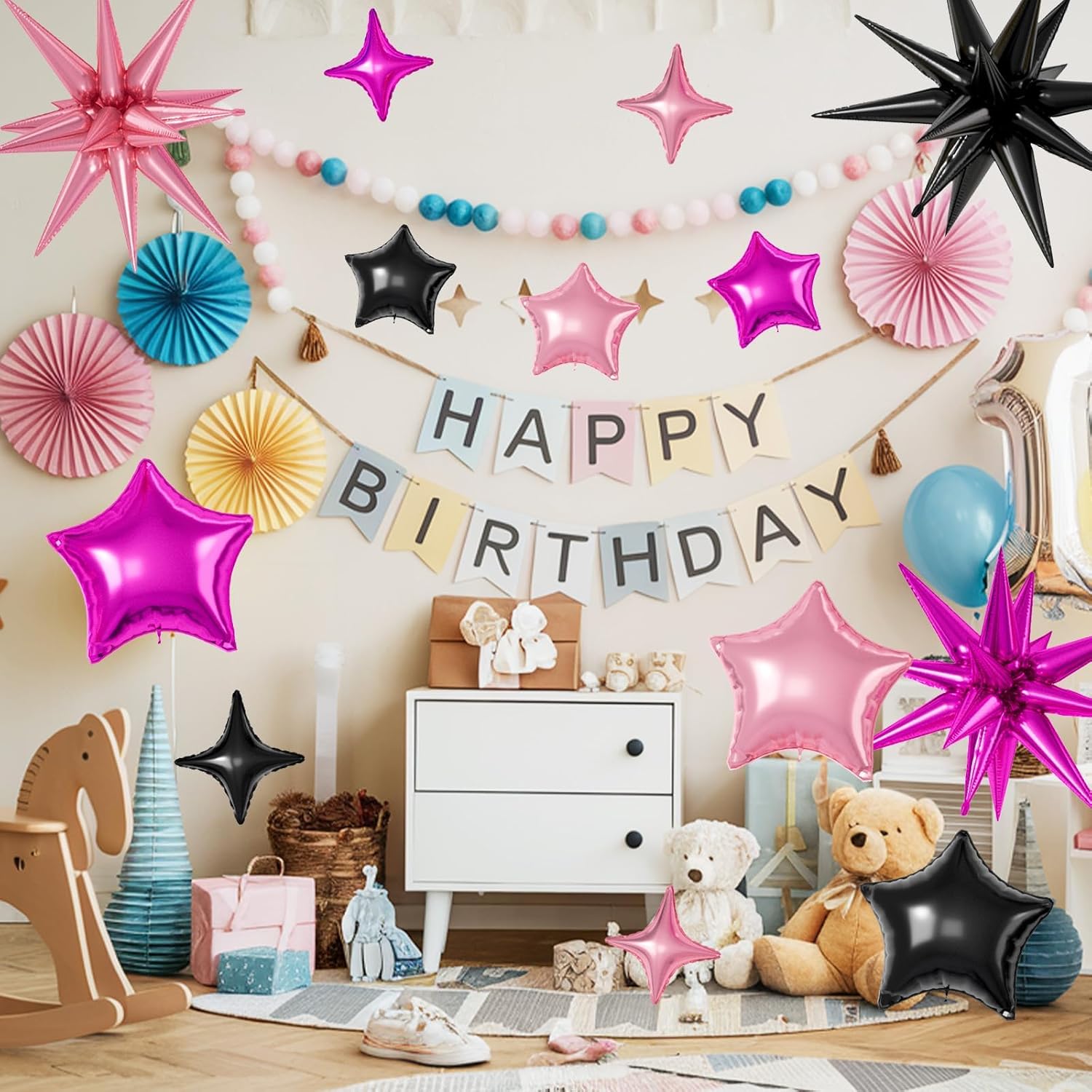 - ăBlack Hot Pink Star BalloonsăThe package includes:6pcs 22-inch Star-Shape balloons(Pink*2,Black*2,Hot Pink*2), 4pcs 10-inch Four-Pointed Star balloons(Pink*2,Black*1,Hot Pink*1), 3pcs 18-inch Five-Pointed Star balloons(Pink*1,Black*1,Hot Pink*1), 3pcs 10-inch Five-Pointed Star Shape balloons(Pink*1,Black*1,Hot Pink*1),1 dispense and 1 straw. These foil star balloons are Great for birthdays, weddings, baby showers, and engagement parties
