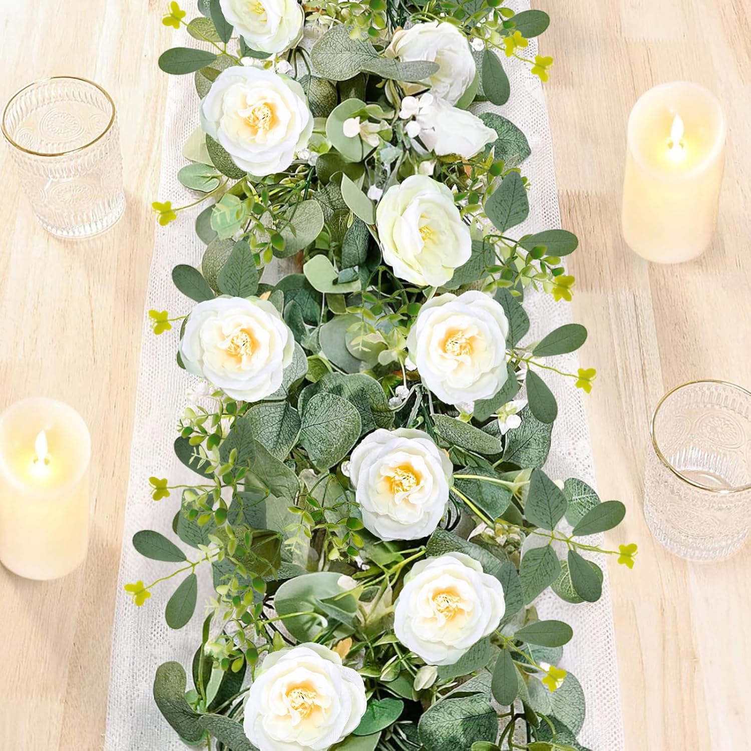 - 【 Spring Garland for Home 】 Package includes 2 packs 6ft eucalyptus garland, One Pack is a roses Garland with 6 rose heads and the other Packs is a common eucalyptus leaf flower vine without roses. the vines perfectly blends realistic and natural rose flowers with eucalyptus leaves. Perfrct for Spring decoration, centerpiece table decorations, table runner, wedding decor and home decor.