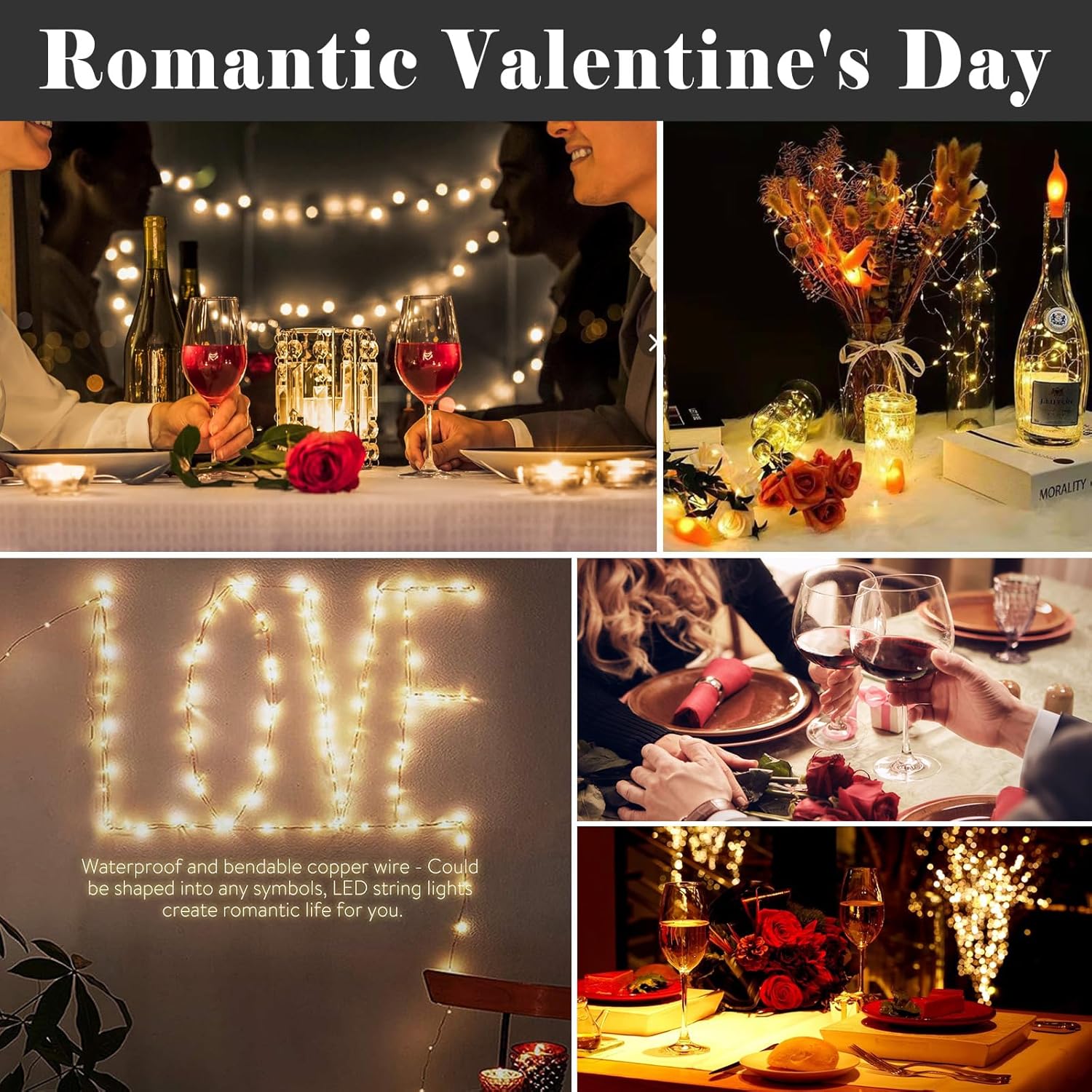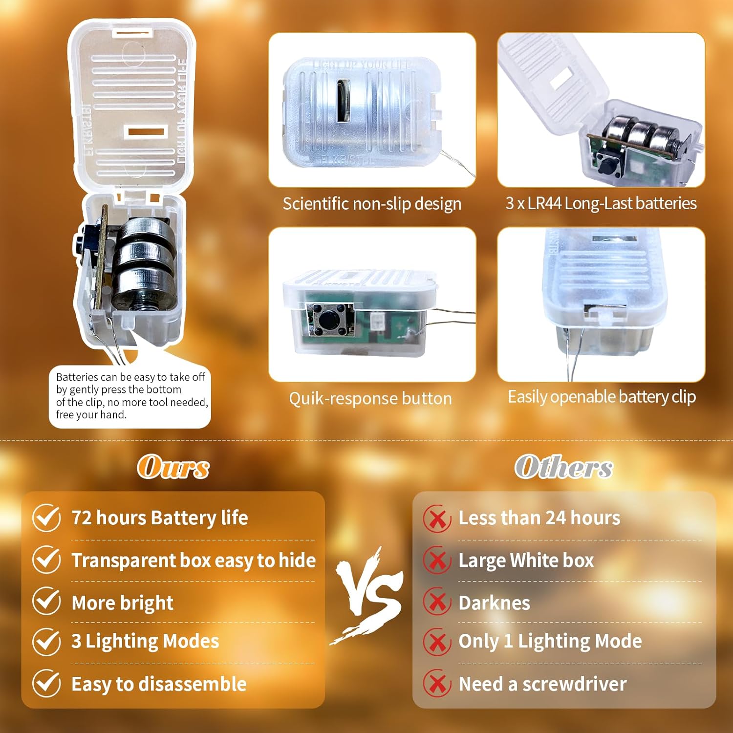 - 3 LIGHTING MODES AND WAIDELY APPLICATION: The fairy lights are super convenient enables to switch 5 flashing modes, Fast Twinkling, Slow Twinkling and Constant Lighting; This versatile battery operated lights can be used for Christmas decoration, holiday, Halloween parties, Valentine's Day, wedding, bedroom and centerpiece table decorations. Giving you different decorative effect and romantic atmosphere