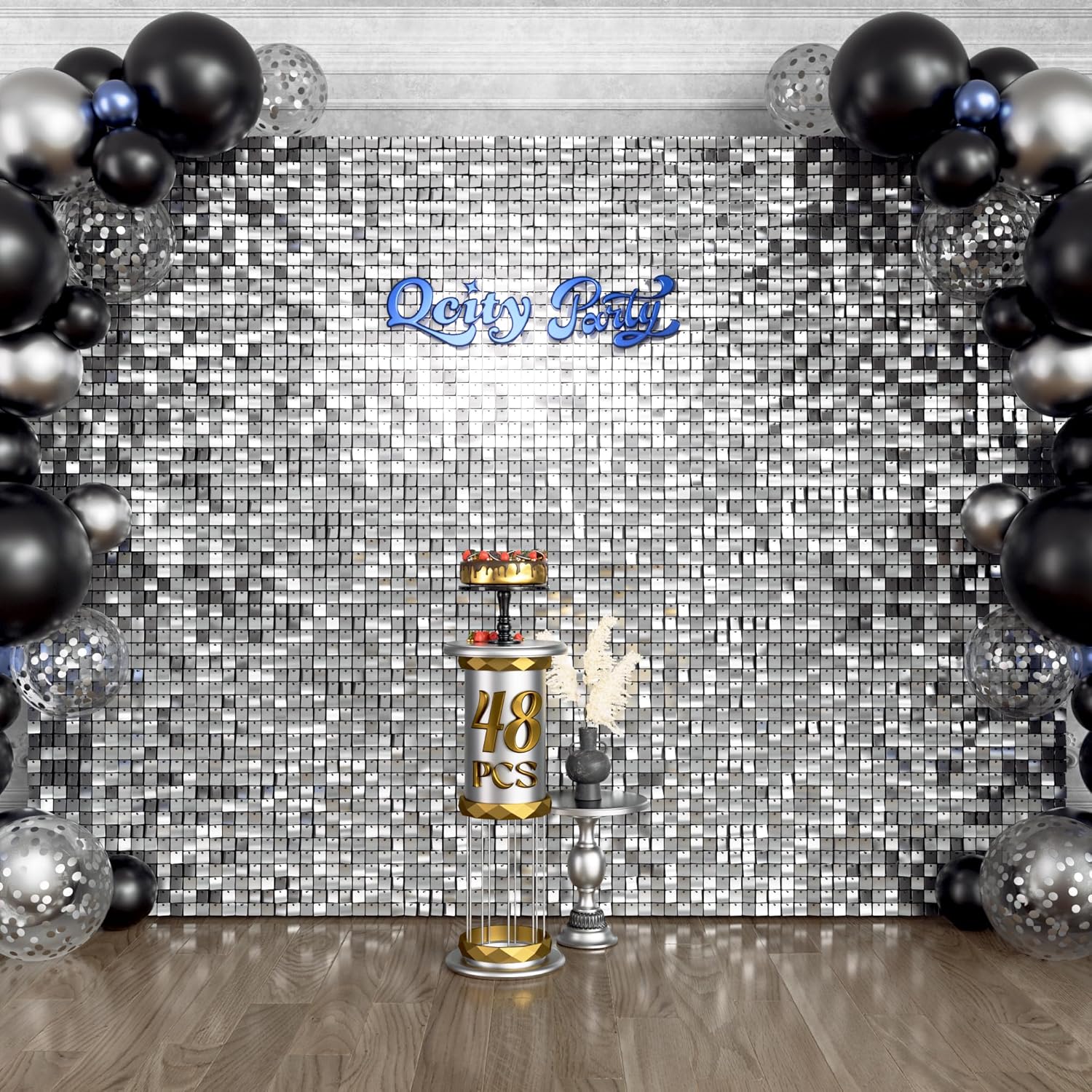 Qcity Silver Shimmer Wall Backdrop 48PCS, Black Back Not See-Through Design, Square Sequin Glitter Backdrop Panel, Perfect for Outdoor Events, Birthdays, Wedding and Party Decoration