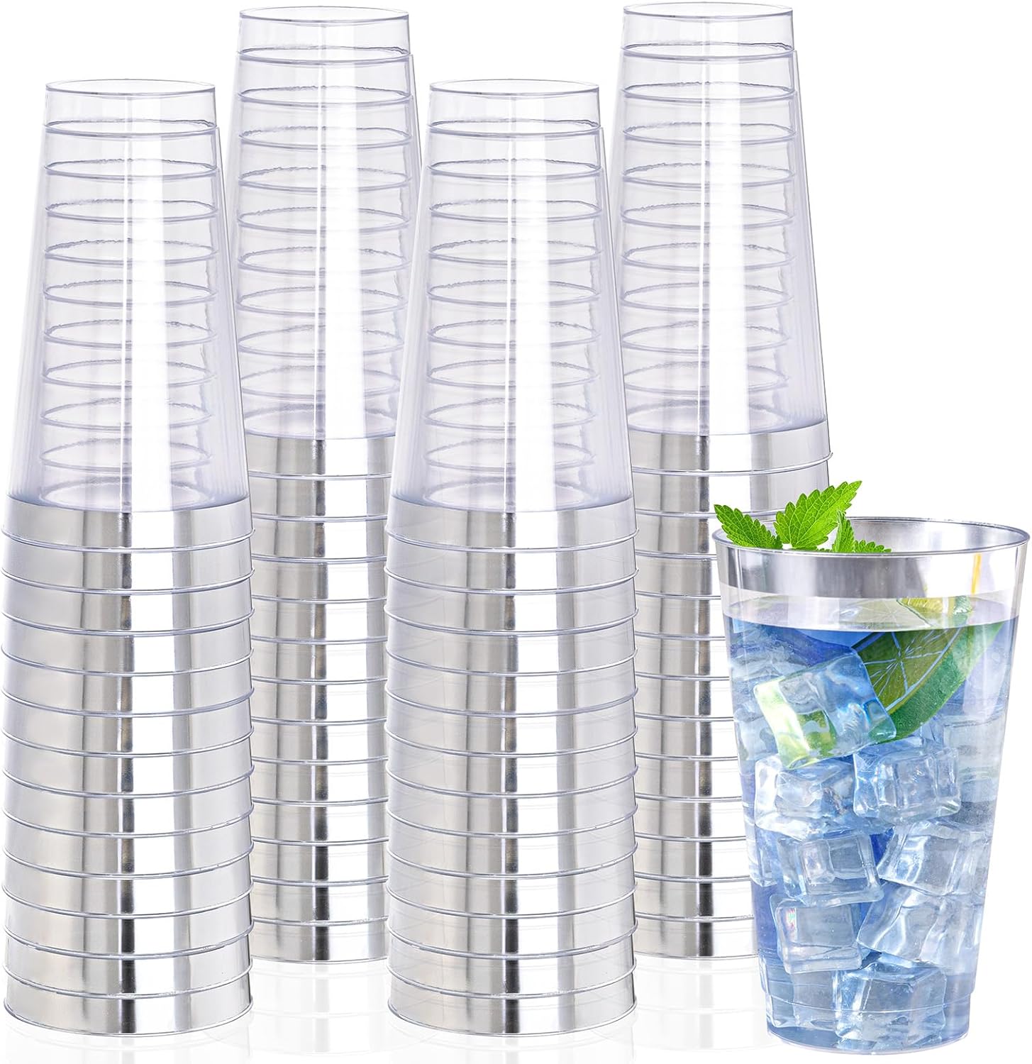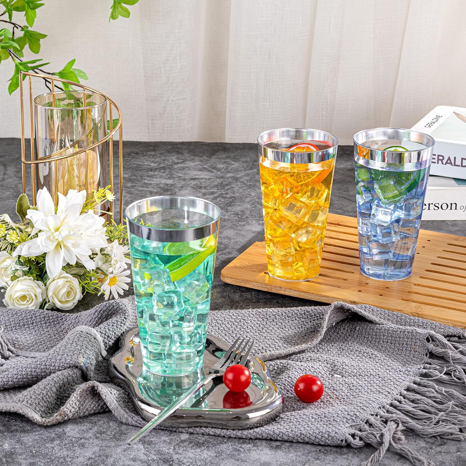 I00000 16 oz Silver Plastic Cups, 50 Pack Clear Plastic Cups,Silver Rimmed Disposable Cup, Heavy-duty Disposable Tumblers Perfect for Party, Holiday, Wedding & Birthday