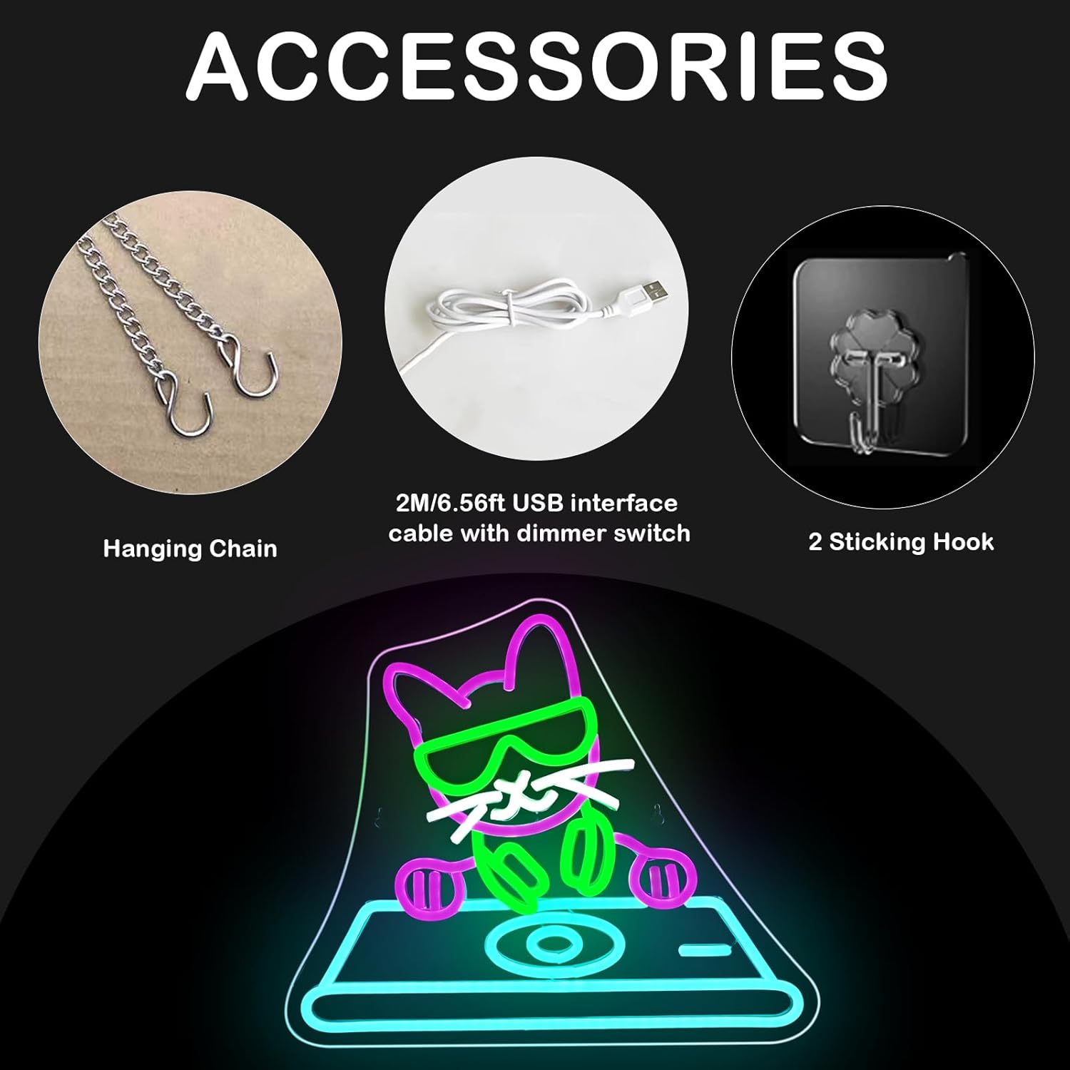 Cool DJ Cat Neon Sign – LED Wall Light for Bedroom, Game Room, Music Studio, or Bar, USB Powered, Dimmable, 14.9"x12.6"