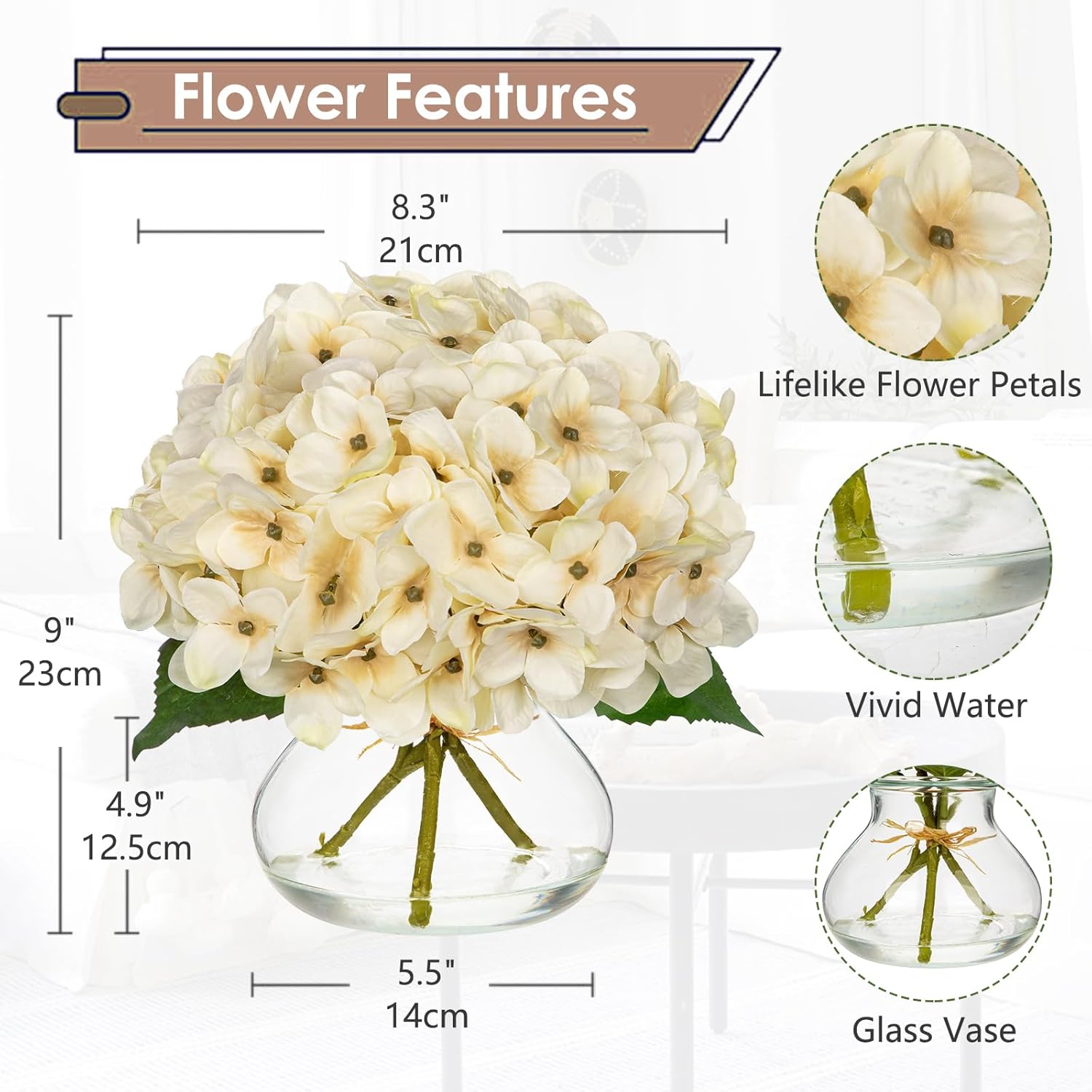 - 💐【Realistic & Elegant】Fall hydrangea artificial flowers for decoration with glass vase suits look so beautiful, unique craft design, brings different visual enjoyment to your home, create a romantic atmosphere, make you happy every day. Faux water on the vase adds to the pulchritude and realism. More realistic because of the details!