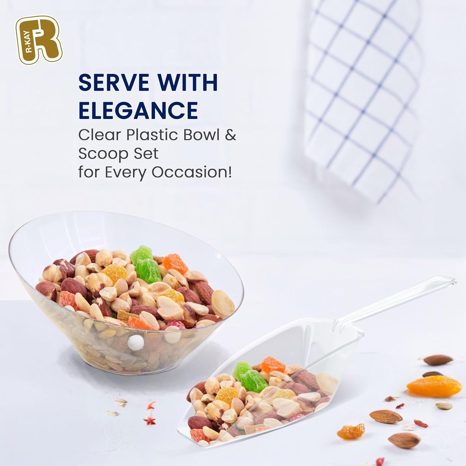 - FULL CANDY BAR DISPLAY SET: This set includes all you need to host your next party it includes premium clear disposable bowls and plastic scoop for ice, and it can be used for all kind of foods as candies, nuts, fruits, popcorn, snacks etc.