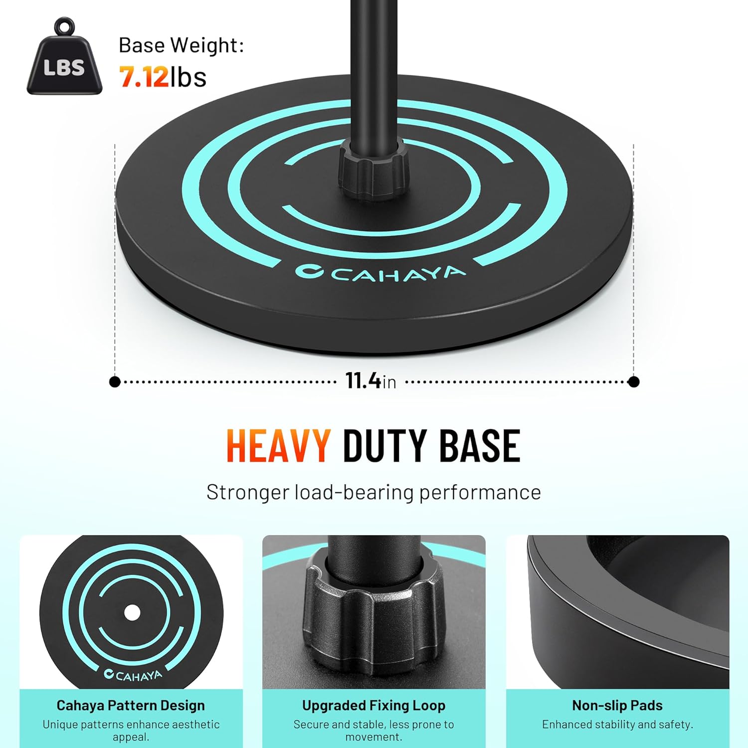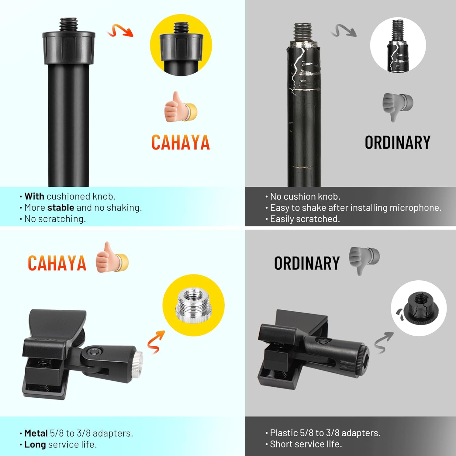 - 【Upgraded Weighted Solid Base】: Compared with tripod stands, CAHAYA mic stand features a metal round weighted base (7.12lbs, 11.4in diameter). The base of the floor mic stand is flat, wide and heavy enough to provide strong stability and accommodate your heaviest microphones. The base also features the CAHAYA logo for a stylish and professional look.