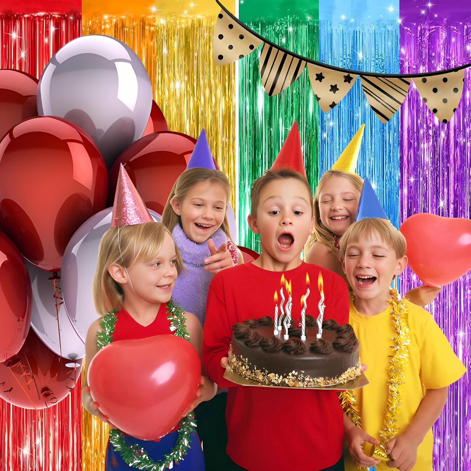 - Pair with other party decorations: Tinsel backdrop curtain can be paired with LED lights, balloons, banners, wreath, garlands, swirl streamer, tissue paper pom poms Wait for more scenes