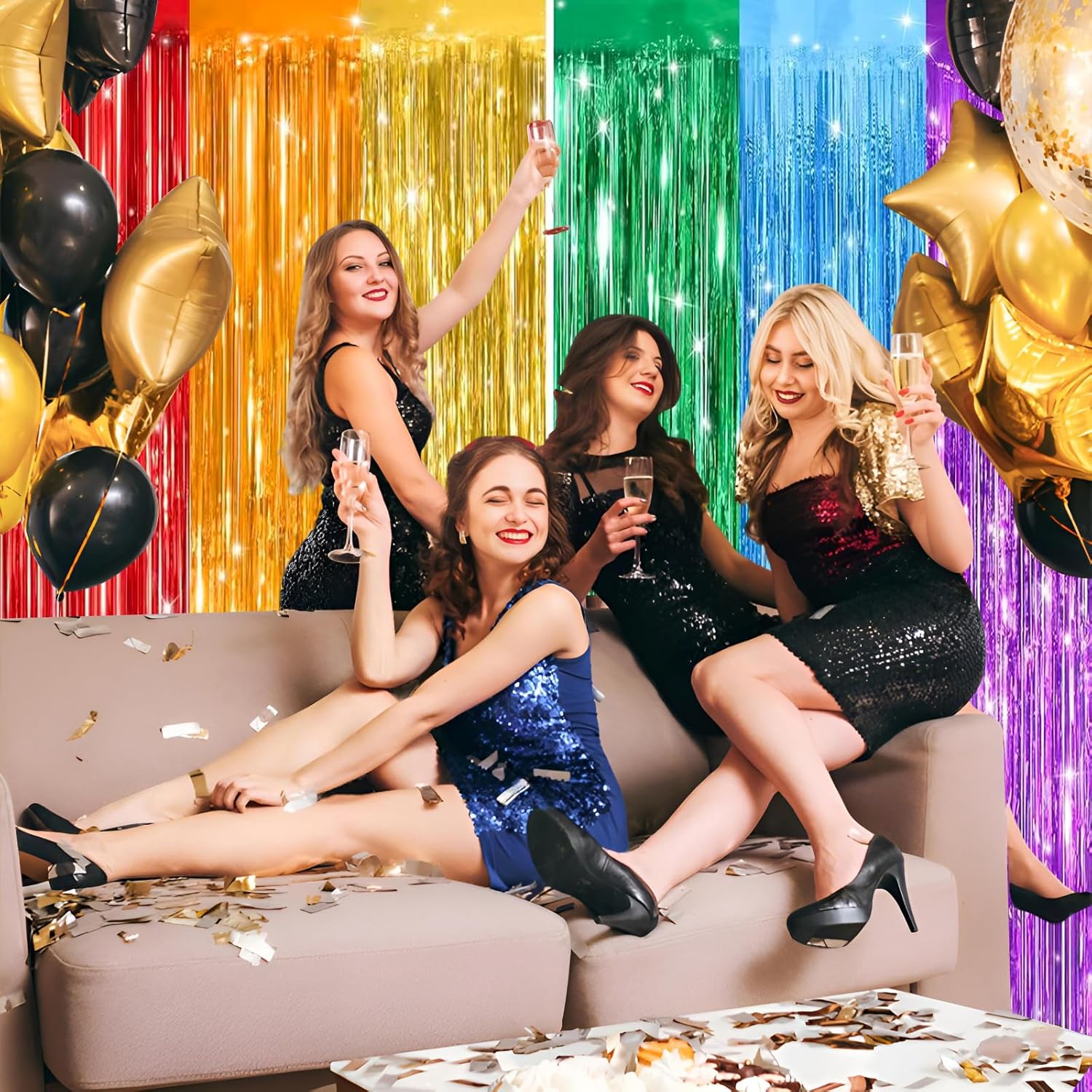 - Easy to use: simply tear off the adhesive tape backing and paste the fringe curtain on the wall, window, table, door, or anywhere you want to add some sparkle to your party. For an even fuller effect, hang each individual tinsel fringe curtain in different locations! And it's also possible stitch and overlap curtains with two or more pieces to achieve unexpected results!
