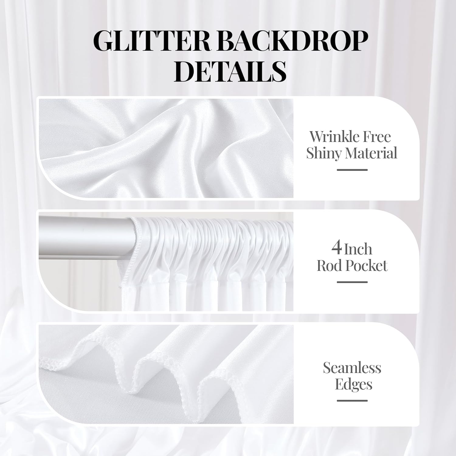 - 【Satin Backdrop Curtain】Our 10x10ft white glitter backdrop curtain panels are perfect for adding a touch of glamour to any event. Made with thick, high-quality shiny satin fabric, they shimmer beautifully without losing sequins, ensuring a stunning display. Each set includes two 5x10ft panels, providing ample coverage for weddings, parties, or photo shoots.
