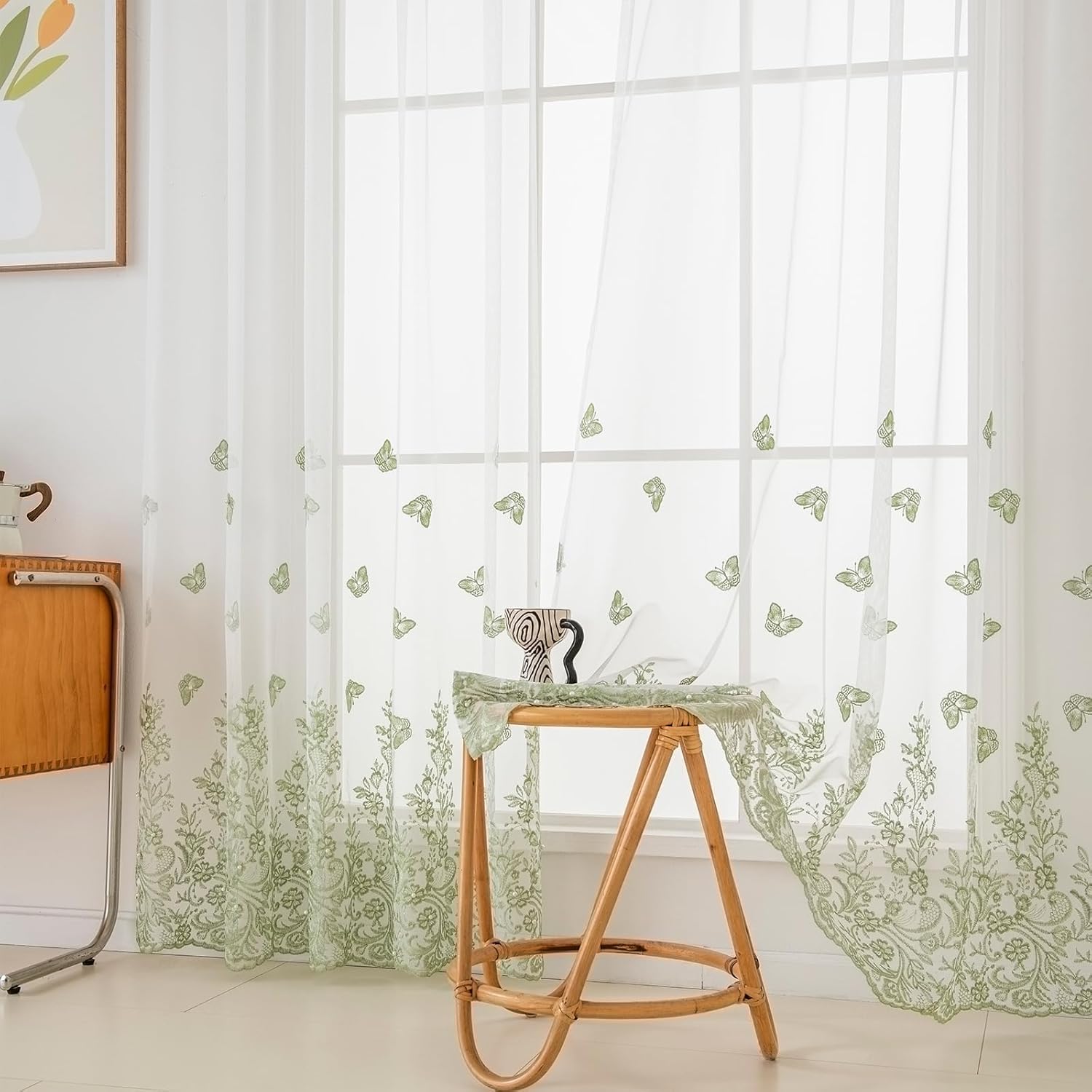 VISIONTEX White Sheer Voile Curtains, Decorative Green Embossed Butterflies Rod Pocket Window Drapes for Home Kitchen, Living Room and Bedroom 54 x 72 Inch, Set of 2 Curtain Panels