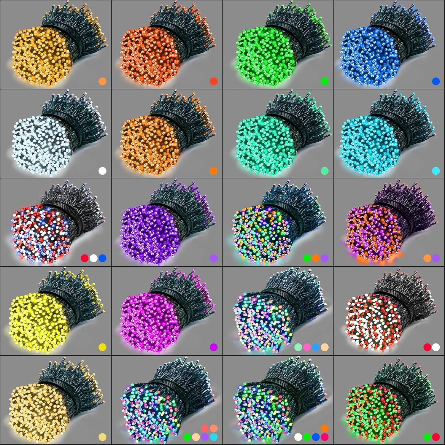 - 35 Colors Changing Christmas Lights: 164ft 500 LED RGB string lights green wire with 17 base colors + 18 holiday themes colors ( “W” button for cool white color / “WW” button for warm white color ), dynamic effects, timer settings and remote control. Ideal for festive decor and ambient lighting. The green wire is natural and rustic, blending seamlessly with courtyard plants and Christmas trees
