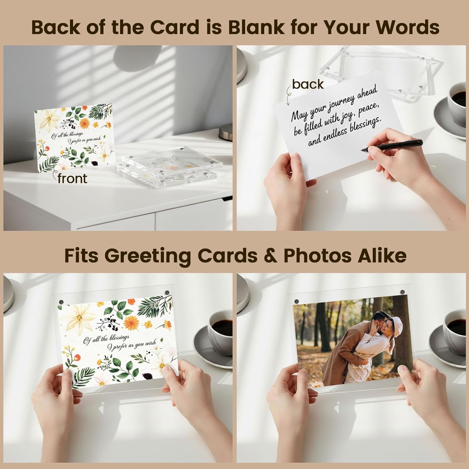 - Transparent Picture Frames Design - Thoughtful Small Item: Our 2PCS magnetic picture frames offer a clear view and come with a cleaning cloth to keep them spotless. The included greeting card lets you personalize your gift message, adding warmth and thoughtfulness. These acrylic magnetic frames offer a fashion, modern look with a floating effect that enhances visual appeal