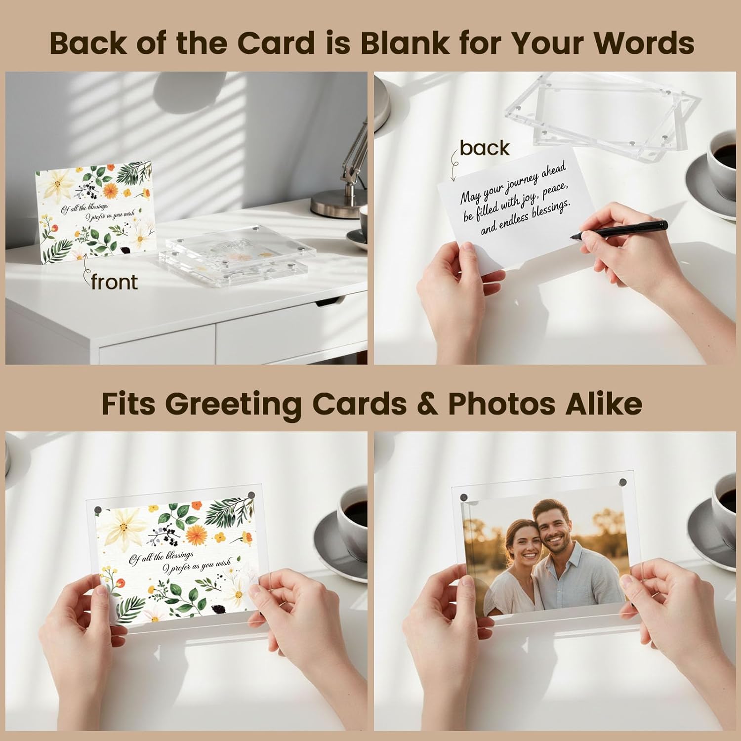 - Transparent Picture Frames Design - Thoughtful Small Item: Includes 2PCS picture frames, a cleaning cloth for dust removal, and a gift card for personalized messages. The double-sided transparent design blends seamlessly with minimalist, Nordic, and modern decor. Its clear acrylic creates a stunning floating photo effect, adding elegance and artistry to your space—perfect for displaying cherished memories
