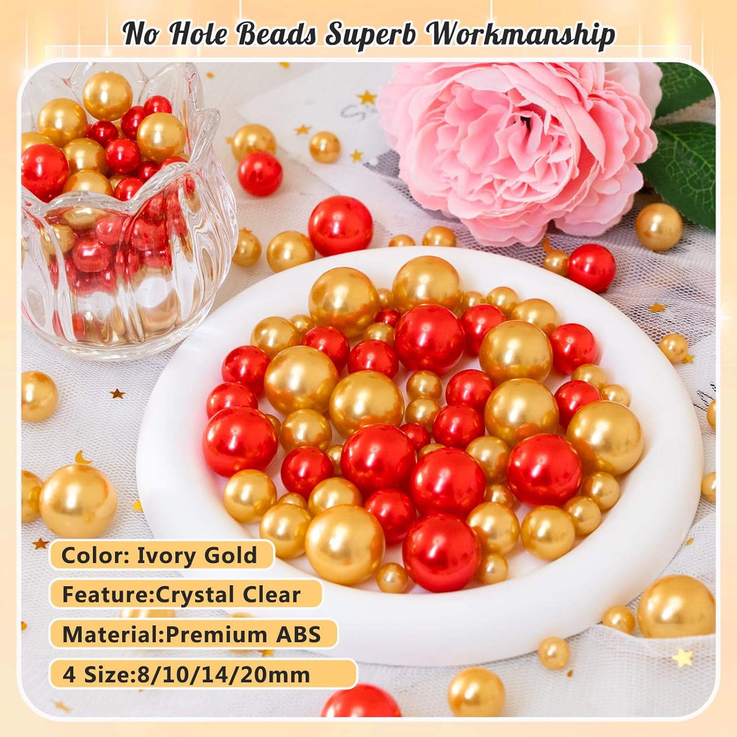 300Pcs Pearl Vase Filler, Red Gold No Hole Faux Pearl Beads for Centerpieces Vases, Candle Centerpieces, Wedding Birthday Party Home Decor 8/10/14/20mm