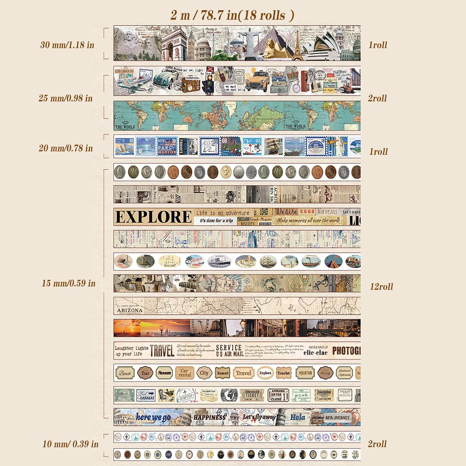 18 Rolls Travel Washi Tape Set journaling Tape for Crafts and Journaling DIY Scrapbook Tape for journaling Scrapbooking Supplies washi Tape for Scrapbooking