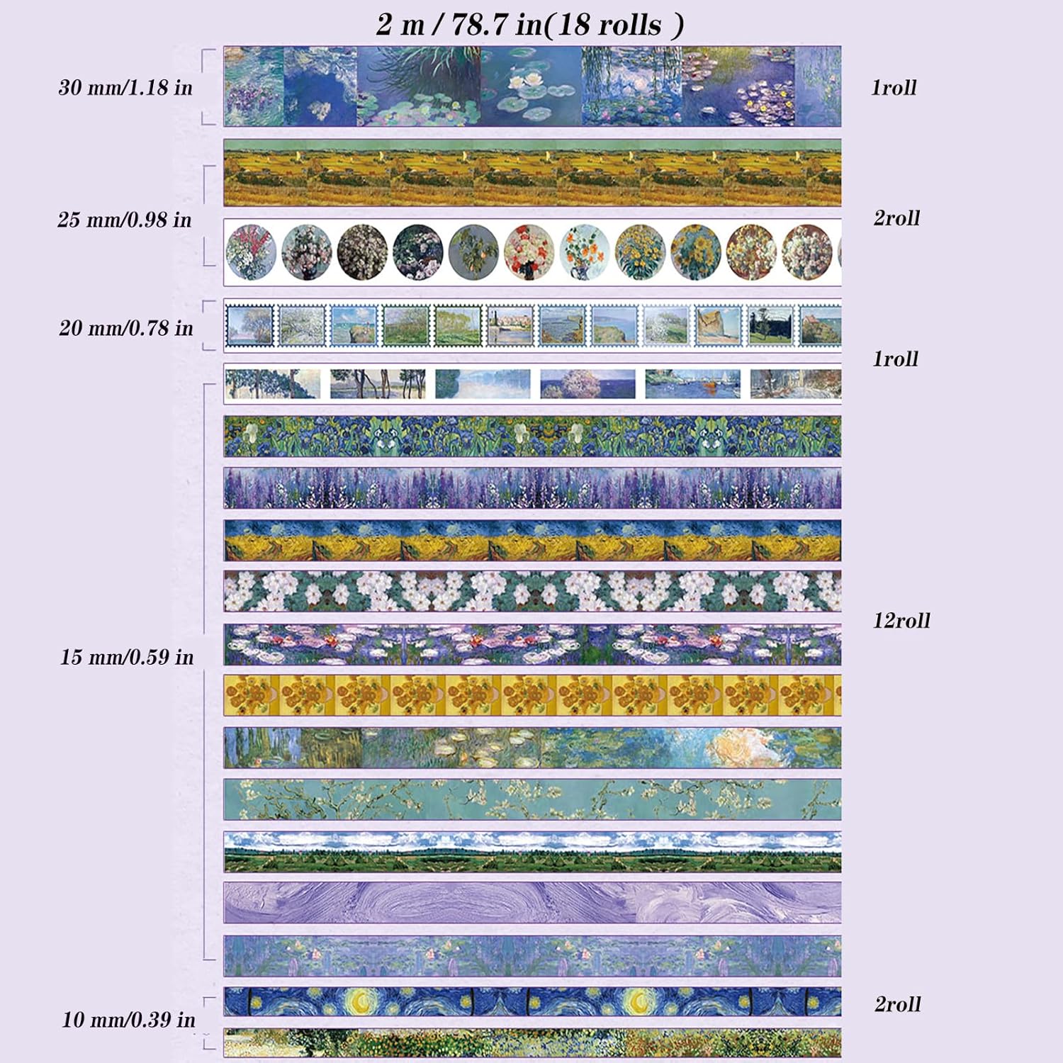 - Van Gogh's Art washi tape comes in a box with 18 rolls of high-quality washi tape in five sizes, including wide and thin washi tape. Each roll is 1.18 inches (30 mm) x 1 tape; 0.98 inches (25 mm) x 2 tapes; 0.78 inches (20 mm) x 1 tape; 0.59 inches (15 mm) x 12 tapes; 0.39 inches (10 mm) x 2 tape.