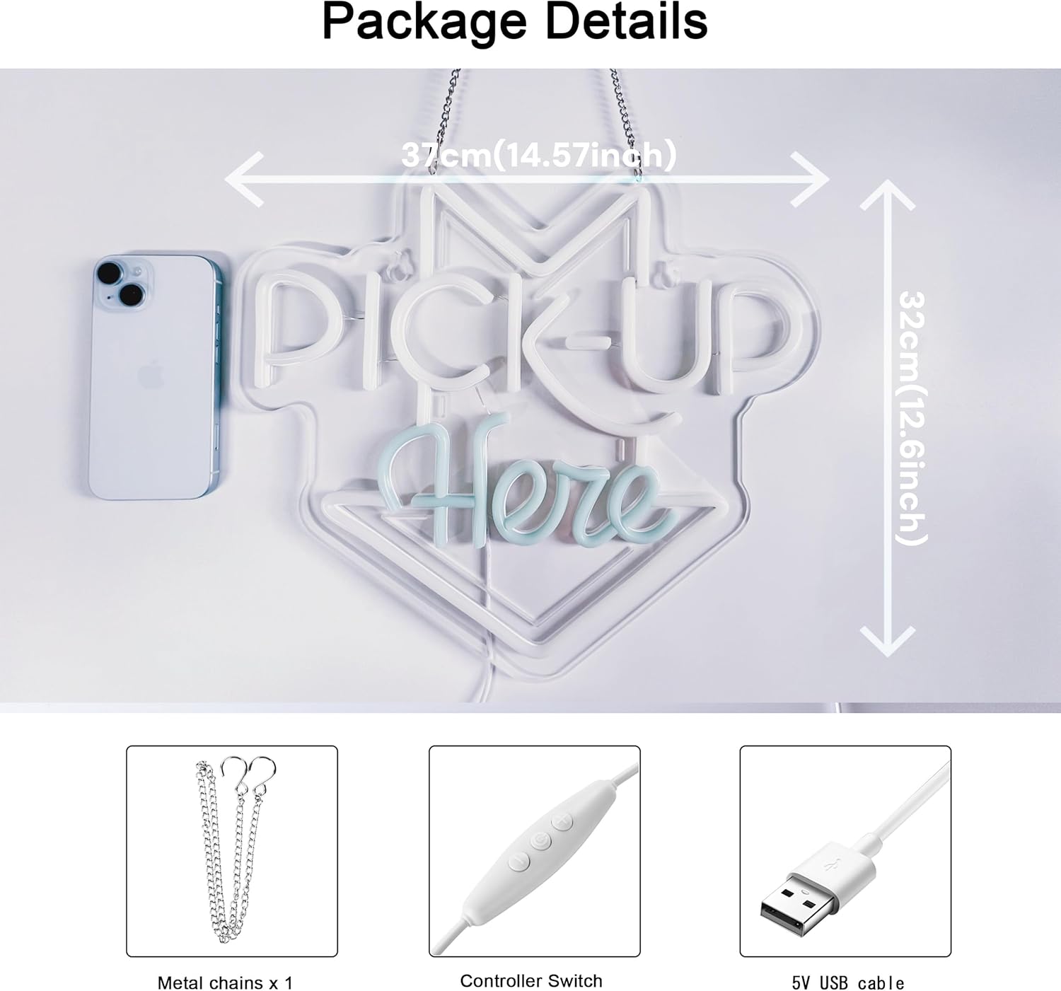 - Make Your Business Stand Out: The pick-up here neon sign is composed of patterns of an arrow and words, with adjustable brightness. Its high-recognition design and vibrant color can attract customers' attention over a long distance let them know easily what your business is, and bring them to your store; It can also create a great atmosphere for your shop if placed inside.