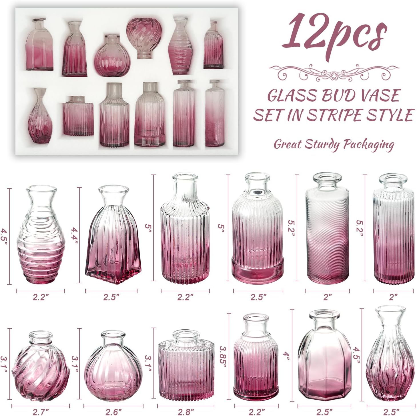 - [Unique Purple Glass Vases Set of 12] - The small rose purple vase in bulk come with 12 different designs of ribbed glass vases for flowers (please refer to the size chart). They are cute bud vases for decor. The romantic purple collections offer a variety for small arrangements, add an extra pretty cute touch to anywhere, especially for wedding centerpieces.