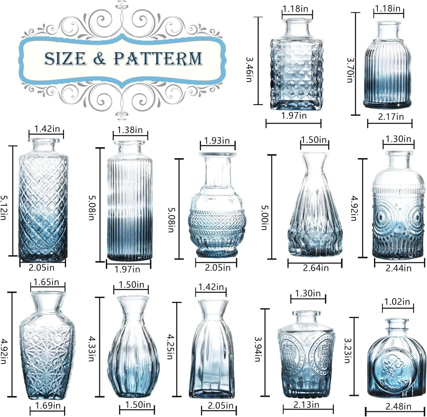 - Vintage Vase: You get 12 glass bud vase, each small glass vase is decorated with etched patterns to further enhance its attractiveness. These flower vases boast a vintage design, equally suited for elegant centerpieces and casual home decor, perfect for displaying on windowsills, dining tables, or wedding reception displays
