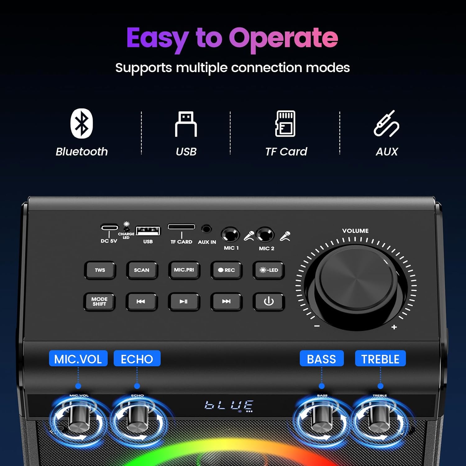 - All-in-One Karaoke : Unleash your inner rockstar with this versatile karaoke machine! Featuring a built-in 30W speaker, 2 wireless microphones for duets, easy-to-use controls, and vibrant LED lights. 6-in-1 Wireless Connectivity Bluetooth 5.1, USB/TF/AUX ports, FM radio, and 2 wireless mics. Perfect for karaoke, parties or outdoor camping