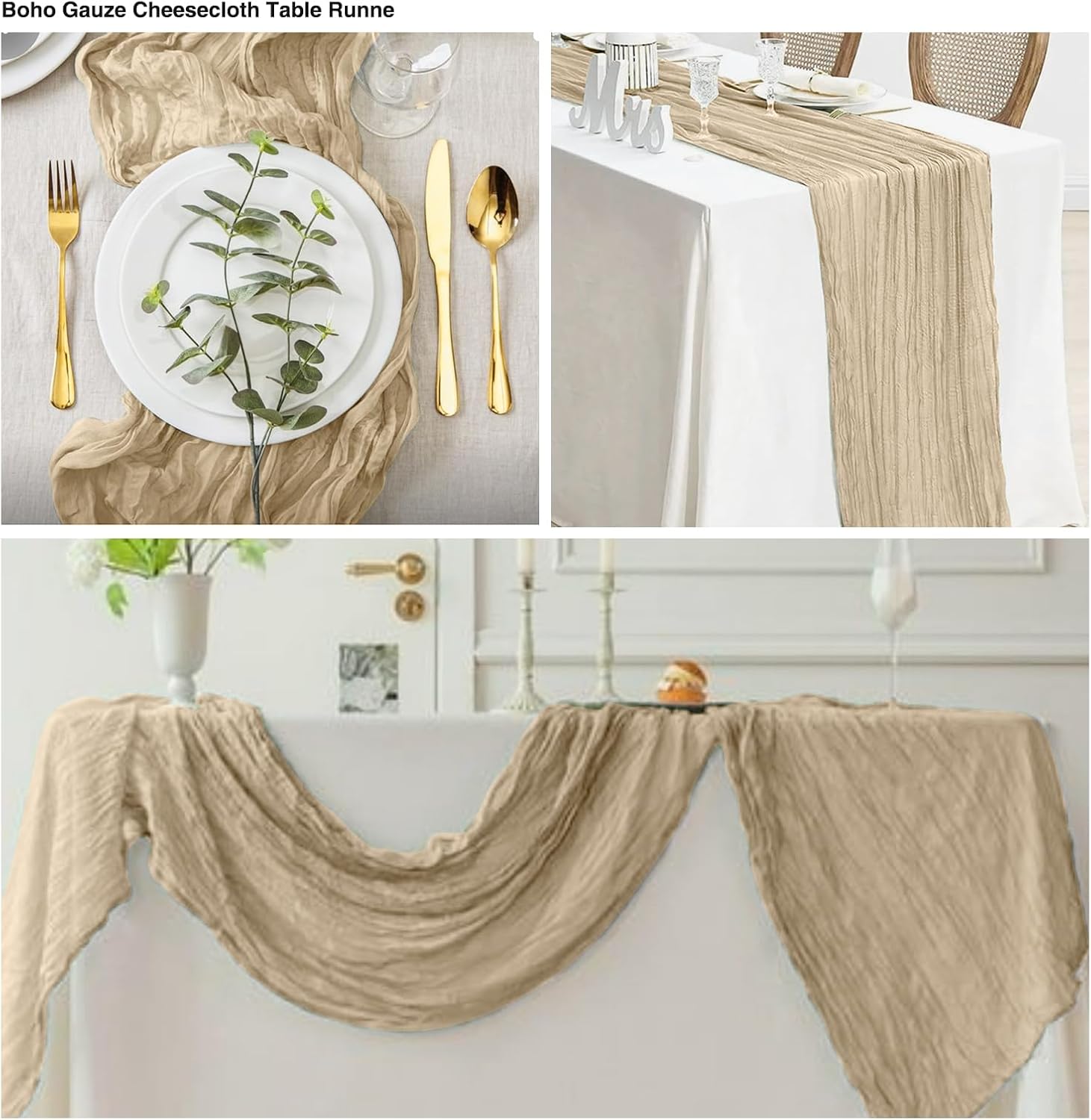 6 Pack Beige Cheesecloth Table Runner 21x120 Inch Boho Wrinkled Sheer Romantic Gauze Decor for Wedding, Bridal Shower, Birthday Party