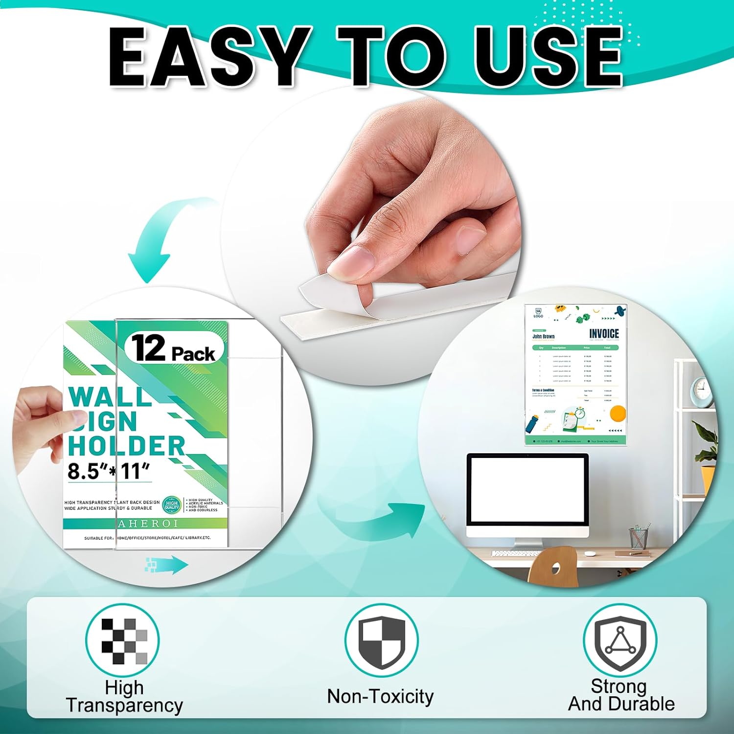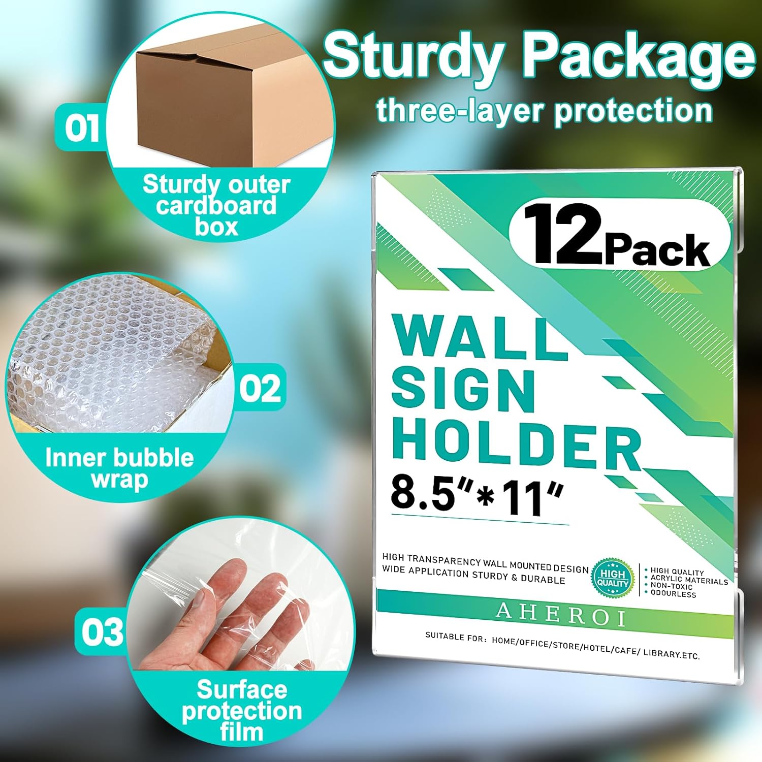 Aheroi Acrylic Sign Holder 8.5 x 11, 12 Pcs Clear Document Frame with Adhesive Tape, No Drilling Plastic Wall Mount 8.5 x 11 Acrylic Hanging Frame Plastic Sign Holder for Office Business Menu Store
